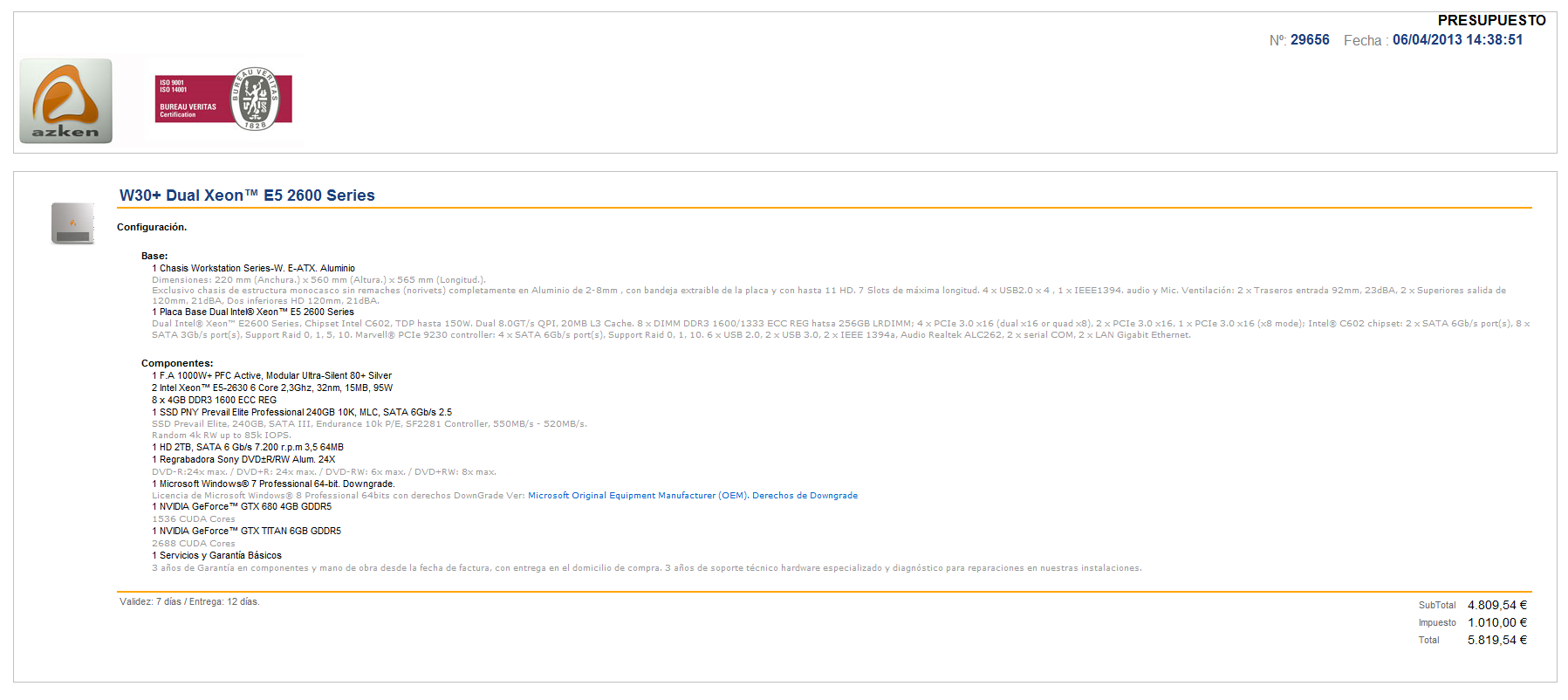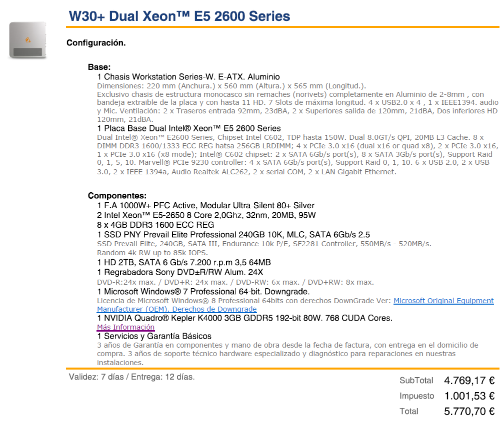 Cuanta más información incluyas mejor. No entiendo la decisión de incluir una GTX 680 en lugar de una Quadro cuando está claro que vas a trabajar con 3ds Max de acuerdo a lo que comentaste. Es que con el presupuesto que te piden (incluyendo transporte e iva) por montar dos Xeon puedes montar casi 2 equipos con 2 i7 para montar una granja de render que probablemente te daría más rendimiento.