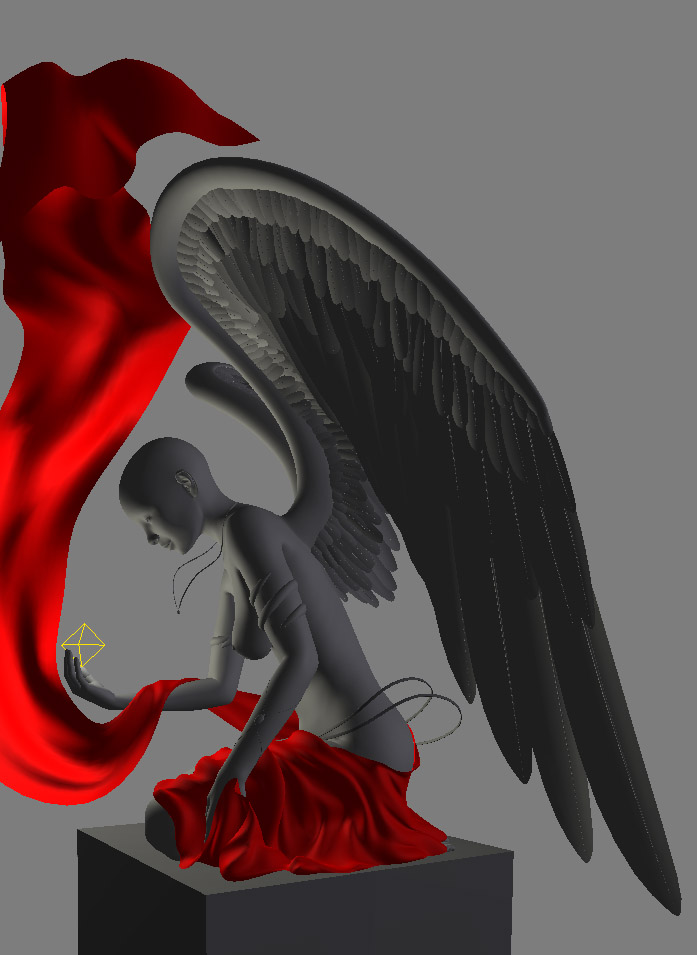 Bueno, aquí tenéis los cambios. Sobre todo, he tocado la cámara, la tela y la forma de las alas. Intente arreglar un poco la unión cuerpo-ala, pero no me gustó lo que probé, los músculos no le pegaban, total, que me esperare a texturizar para ver cómo queda y si acaso le añadiré alguna capa de plumas finas.
