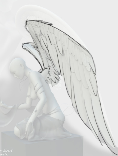 Tiene muy buena pinta, tanto el modelo como las alas. Sin embargo, yo también giraría un poco la cámara para que se viera más de frente, más que nada porque así se ocultaria un poco la unión entre las alas y la espalda, que salen tipo cuerno y tal vez sea poco creíble (digo creíble por decir algo, nunca he visto un Ángel). Además, las alas se verían más grandes también.