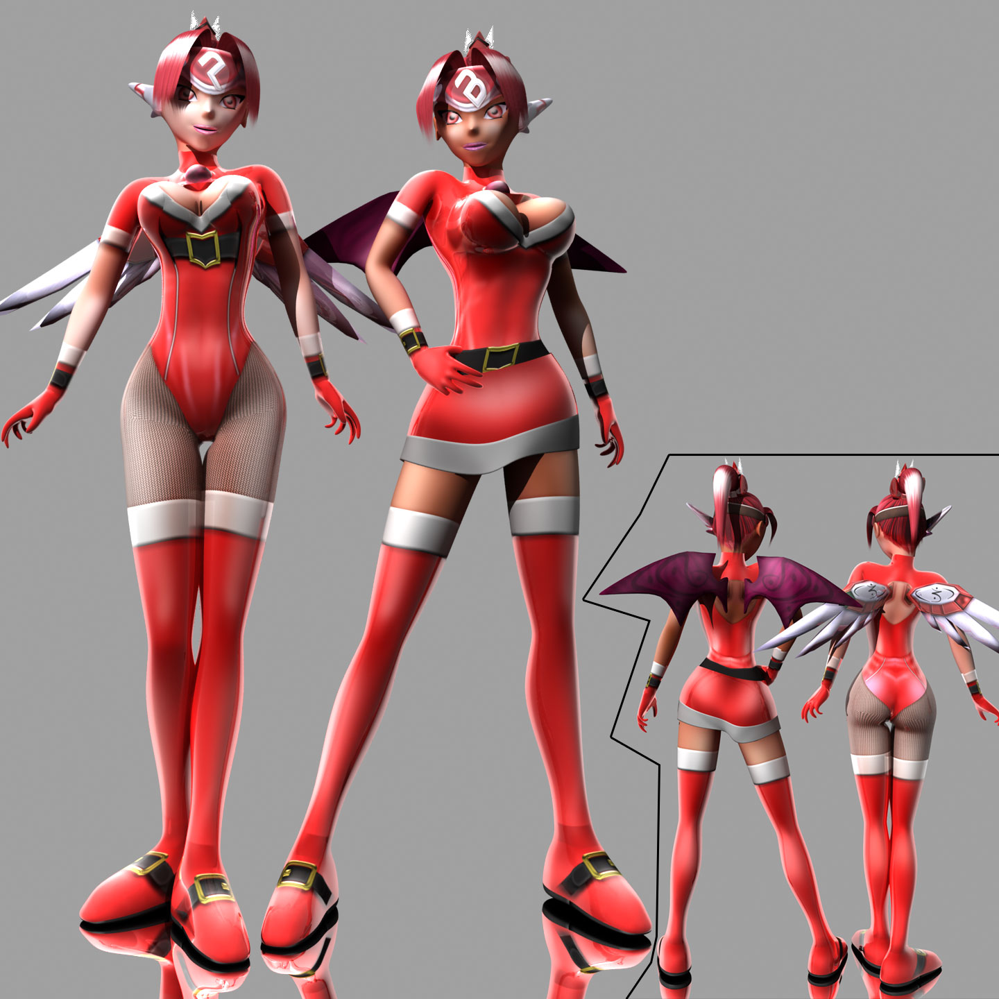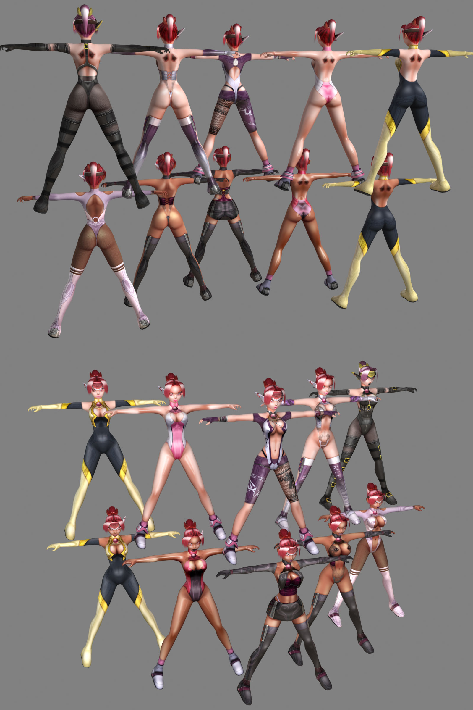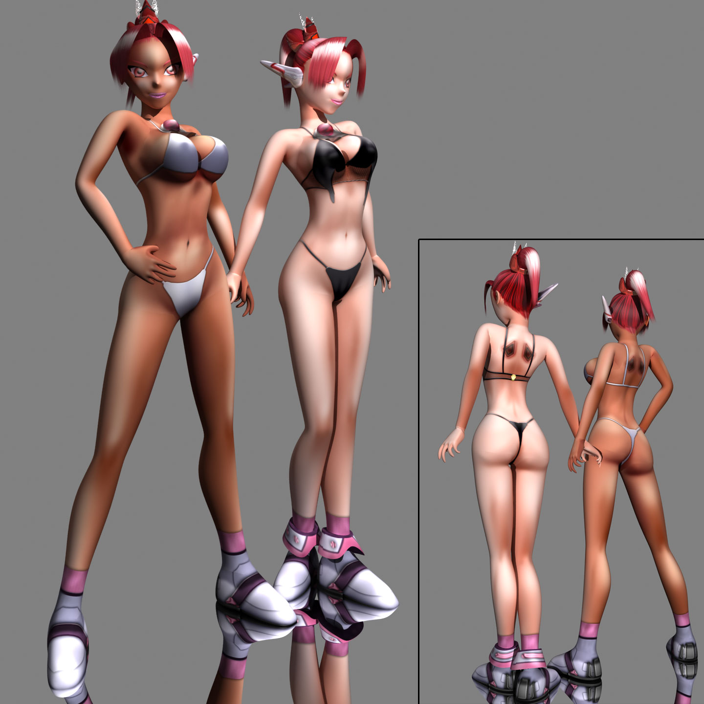 Estos modelos fueron hechos a partir de otro modelo de mayor resolución de cuya ubicación no me acuerdo ahora. Ese modelo perdido tenía algunos detalles que no eran de mi gusto, como el trasero más pequeño (de forma que no resultaba atractivo), los pechos más redondos (demasiado, no parecían reales, aunque tenían el pezón por geometría, no por textura), el tronco más corto (por poco el final de la caja torácica tocaría el hueso sacro), los brazos más cortos y un rigging mal hecho en los hombros, aunque este tampoco es nada del otro jueves. El otro modelo tenía dedos en los pies, como este estaba pensado para llevar sólo zapatos, los remplacé por una geometría más sencilla, con forma de zapato, lo cual ayudaba a mantener a raya el número de triángulos (la idea era el lowpoly), además el otro modelo movía los dedos, este los tiene en una postura fija, neutral, digamos. La cabeza la rehíce desde cero siguiendo el modelo juanadarqueño (aquel tutorial, ya sabéis), el pelo es geometría sencilla con textura y opacidad, ¿cómo se puede ver, hechos en Adobe Photoshop. Estos dos modelos salieron de un primer modelo genérico que fue modificado para obtener a ambas las dos (por ejemplo, la negra las tiene un poco más grandes).