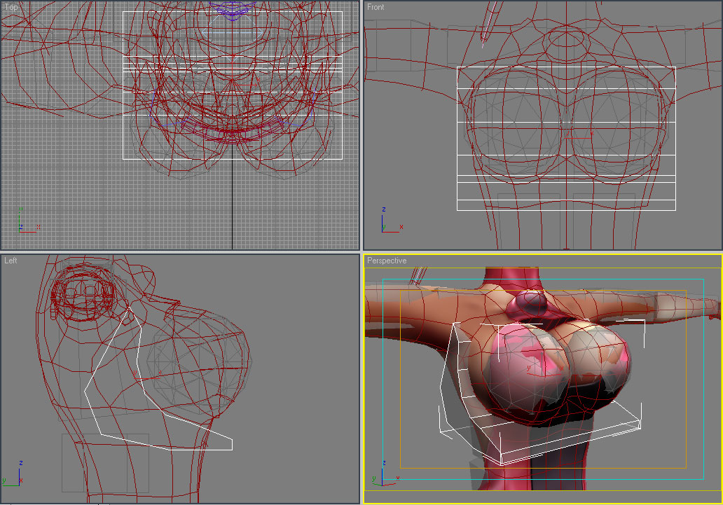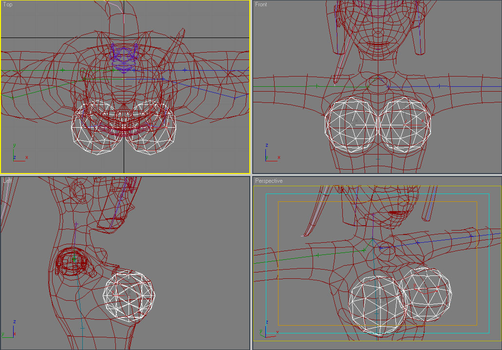 Una vez acabado el modelo en cuestión y hecho el rigging básico (esto es, usando huesos de toda la vida, supongamos que hemos usado Character Studio para este caso), se procede a crear los huesos de los pechos, que, para simplificar un poco, serán un par de esferas, lo cual nos viene bien por ser figuras convexas. Las esferas estarán ubicadas (obviamente) en dónde están los senos en sí y ocupando casi el mismo espacio (esto viene bien para aplicar más tarde el modificador skin Wrap con los parámetros por defecto). Es conveniente que sean geosferas, se llevan mejor con Reactor por estar basadas en triángulos en vez de en cuadriláteros, y con dos segmentos van bastante bien.