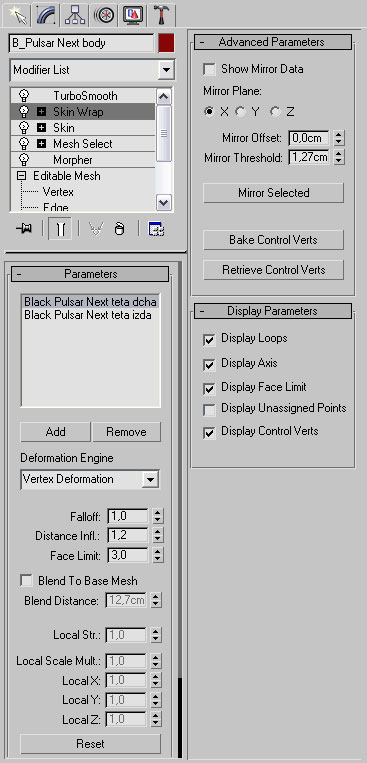 Obviamente, las esferas estarán incluidas en un ayudante sbcollection, y al menos el hueso de la columna vertebral en un RB Collection. El hueso de la columna vertebral tendrá los atributos de Reactor unyielding y Phantom, así se comportara por keyframes de 3ds Max y no de Reactor y los demás objetos rígidos keyframeados por 3ds Max lo atravesaran sin conflictos, pero los flexibles no. Con todo esto, las esferas atadas al hueso del pecho se moverán (en teoría, a falta de unos parámetros fiables de Softbody) correctamente, ahora hay que comunicar ese bamboleo a la malla de nuestra personaje pechugona (nota: no tiene que ser obligatoriamente pechugona, también los puede tener pequeños, pero sensibles), ahí entra skin Wrap. Que, simplemente se añadirá después del modificador skin/Physique/ponga-lo-que-quiera-que-use-para-riggear y a la lista de huesos se añadirán las esferas, no sé si ocurre normalmente, pero con los parámetros por defecto me ruló y bien.