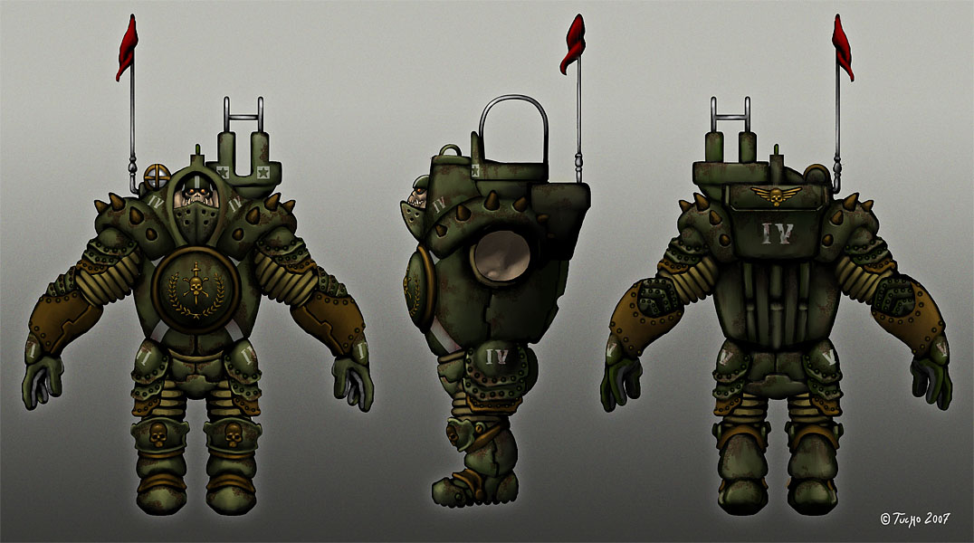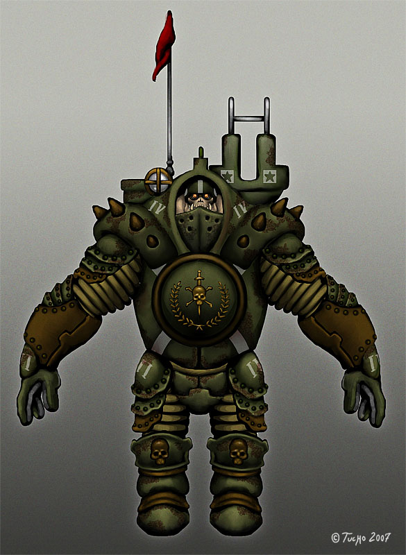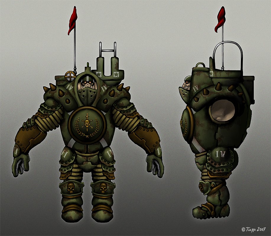 Mi personaje será una unidad de infantería pesada con un puesto de artillería en la chepa, de momento todavía lo estoy diseñando sobre las 2d, pero espero empezar a modelar cuanto antes porque el plazo termina el 15 de marzo y el tiempo apremia.