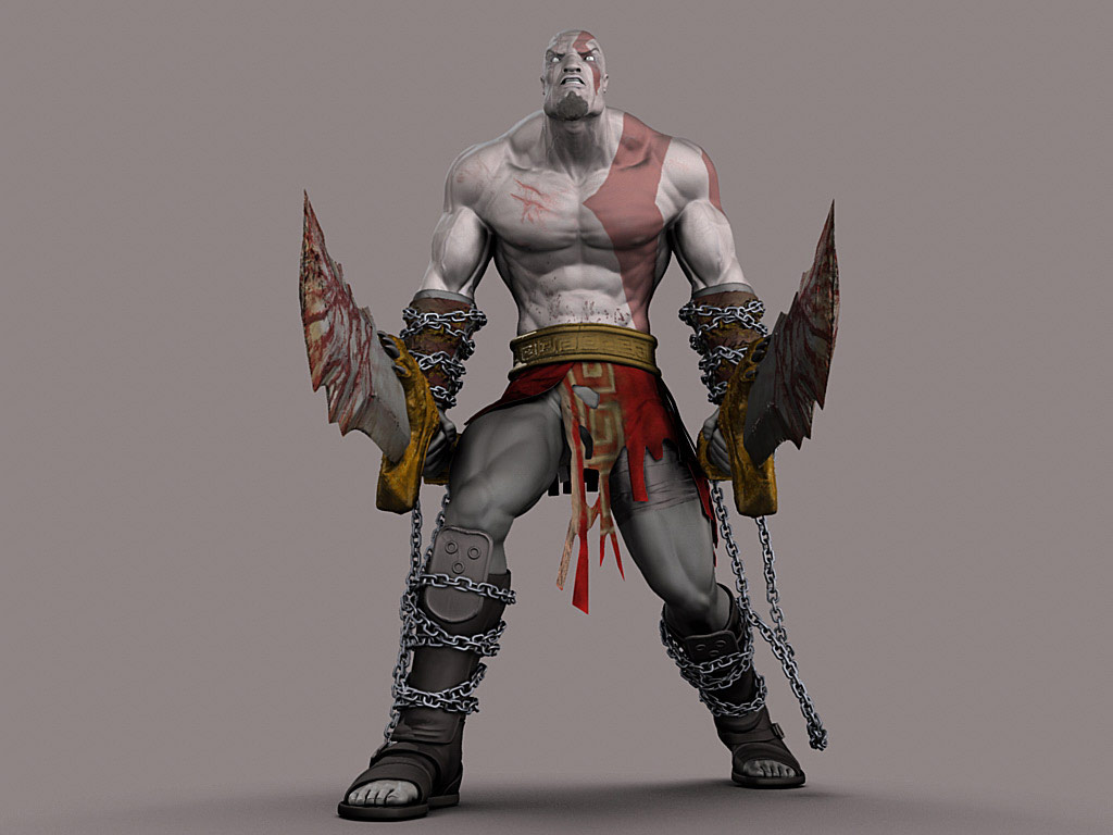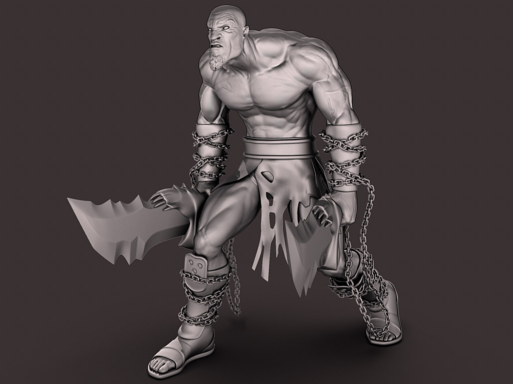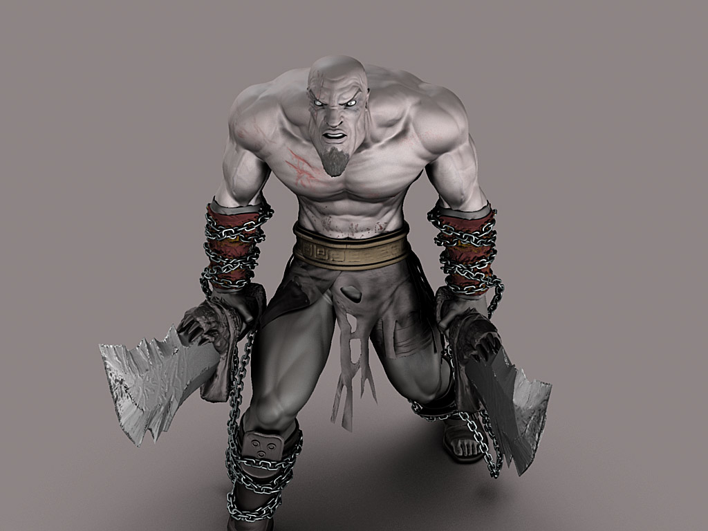 Es que las cadenas en la realidad están fundidas con la piel, y todo sangrientas, pero supongo que, emo todo lo andará porque el trabajo va de la ostia, yo sigo viendo su nariz muy aguileña, y la realmente la tiene de boxeador, luego (aunque ya veo que aún estas con los detalles, pero por si acaso te lo apunto), tiene una cicatriz en la ceja izquierda hasta el pómulo, y otra cosa es la postura, pero esto es al gusto del consumidor, Kratos siempre muestra una postura erecta, altiva, típica de las proporciones/estilo heróicas, y le veo un poco achepao, en ningún movimiento se le ve así, pero si es como lo quieres, perfecto, en mi opinión vas camino de completar uno de tus mejores trabajos.