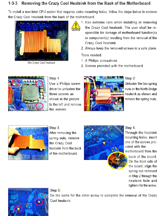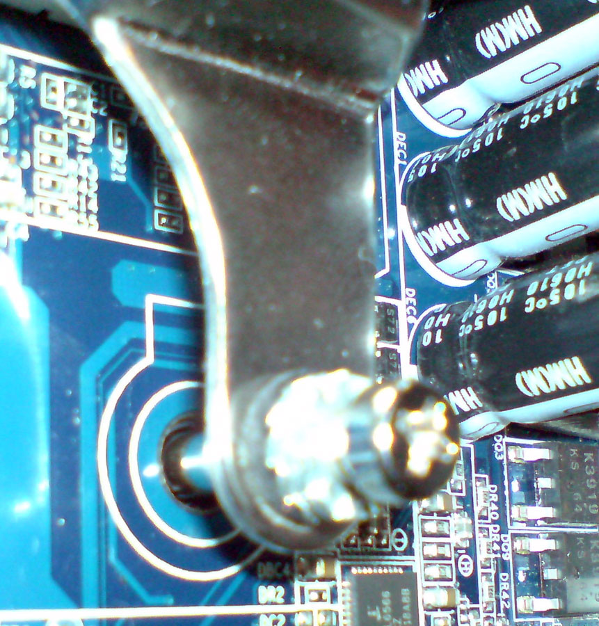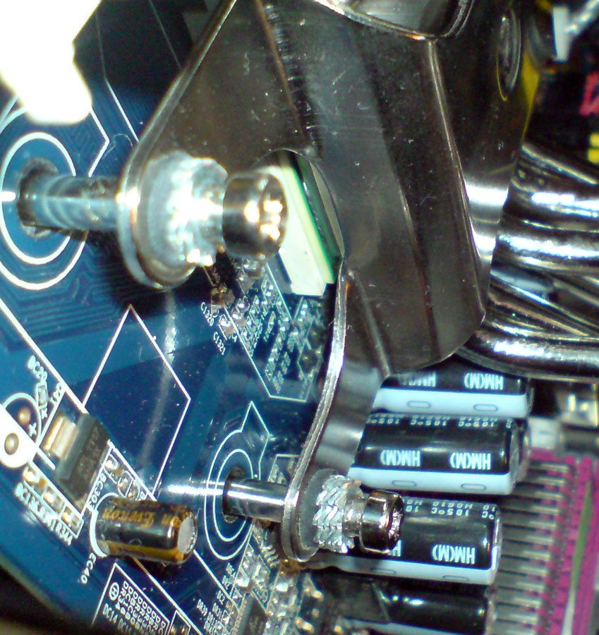 Las soluciones de los manitas para anclar el disipador sin quitar el crazy col son variadas: ponerle unos tornillos más largos, usar tuercas con arandela, cortar las esquinas del Backplate: placa Gigabyte p35 dq6 y disipador micro.