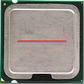 Carefully apply arctic silver 5 directly todo your Quad Core heatspreader. Only apply thermal compound todo the top of the actual CPU heatspreader and not the disipador. The red line in the photo at left depicts the amount and size of arctic silver 5 todo use. Be careful todo apply the thermal compound in the correct direction. To apply a Thin line of thermal compound in the correct direction, do the following: make sure todo orient your CPU heatspreader with the triangle marque on the chip pointing down and todo the left like the photo.