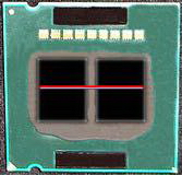 The next photo is a Quad Core processor with the heatspreader removed. You can se when properly applied how the line of thermal compound crosses the Quad Core chip of the heatspreader horizontally. After you apply the line of arctic silver 5 do not spread the line out yourself. When you place the disipador on top of the heatspreader of the CPU the line of arctic silver 5 Will spread out just like an oval pancake. This is done this bien todo insure proper coverage of the heatspreader and a god minimum bond line between the two surfaces.