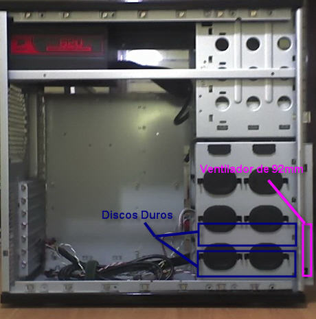 Ya que estoy. Como de momento solo lleva un ventilador frontal y dos discos he pensado ponerlo así:
