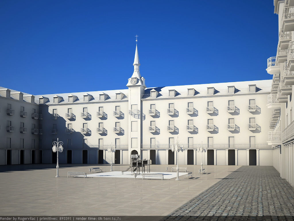 Hola Roger, que tal, está muy bien el modelo, tiene un curro bueno, en el tema de la iluminación, me gusta más la de la primera imagen, ya que se ven iluminada las dos fachadas y por lo tanto todos los elementos salientes hacen sombra, pero bueno eso es cuestión de gustos, he mirado tus settings y en el Irradiance Map yo marcaría la casilla de chek sample visibility, te puedes ahorrar algunos artefactos, y la verdad es que las subdivisiones están altas para un exterior, creo que con 50 30 te daría una calidad muy parecida a la que tienes ahora mismo.