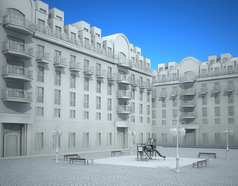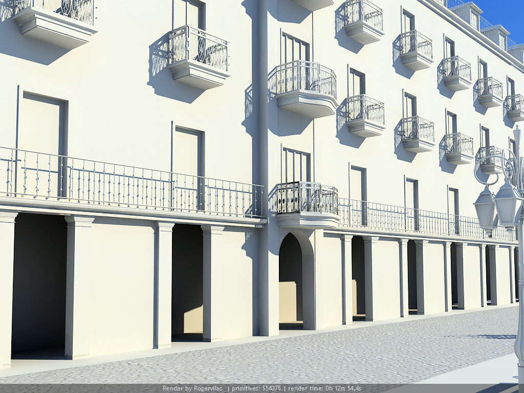 Disinim: los balcones son independientes, creados con Splines renderizables y algún objeto Low poly para detallar más el balcón.