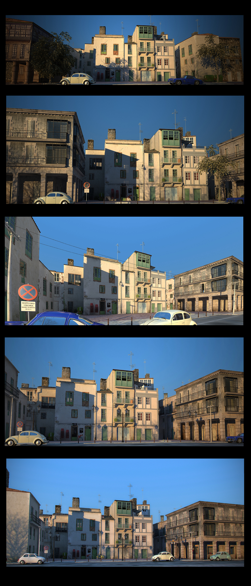 Ahora os dejo unas secuencias de cómo fue el desarrollo de la escena para que veáis las vueltas que le di al entorno, no tanto a los edificios principales.
