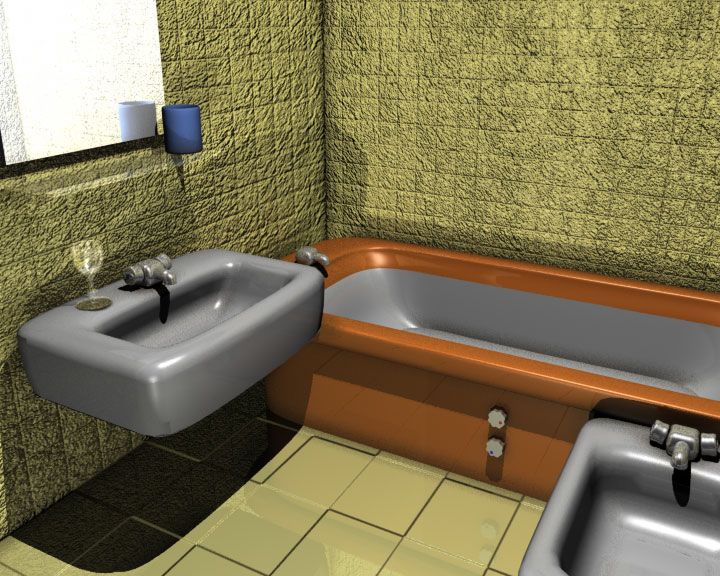Vaya reflexión del espejo, vaya baldosas, y la pared. Lo mejor es esa copa, que la puse porque me gustaba mucho el Raytracing, y tenía que poner cristal, si no, no era feliz.
