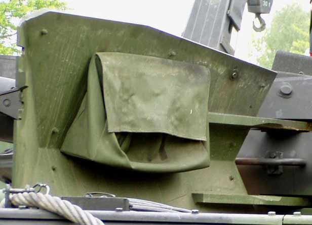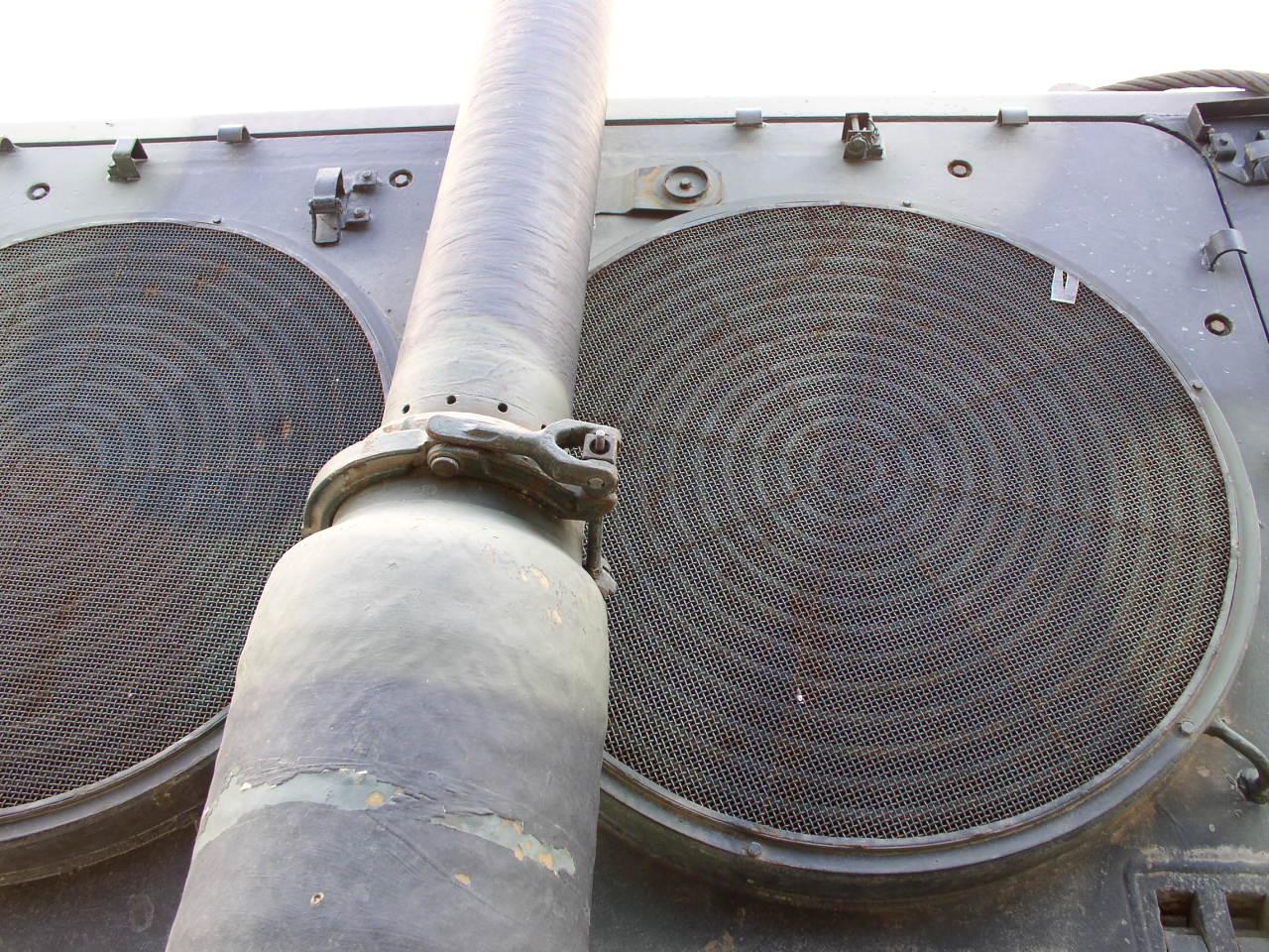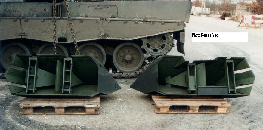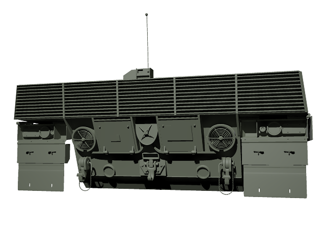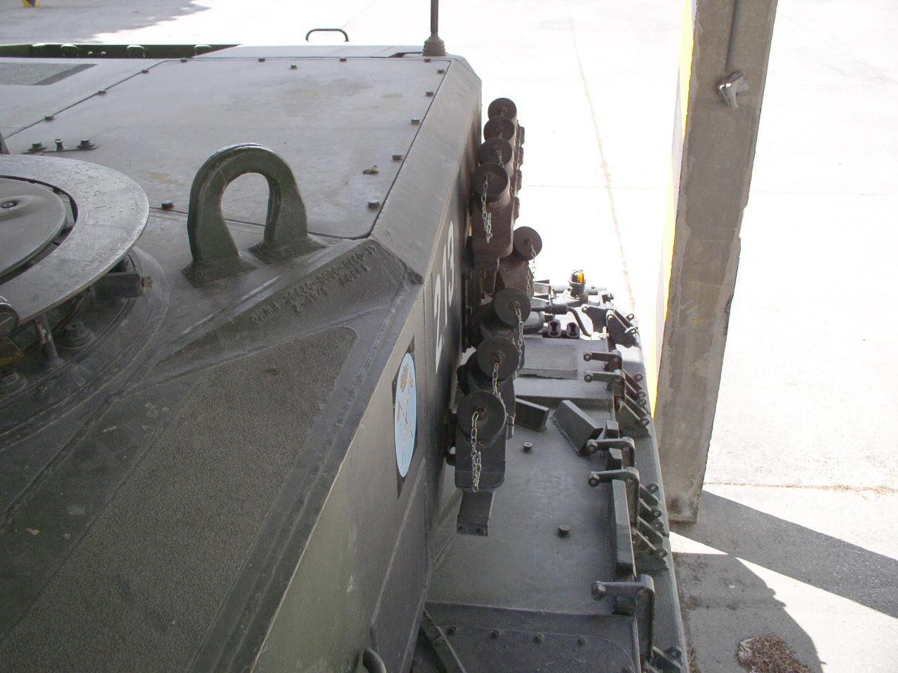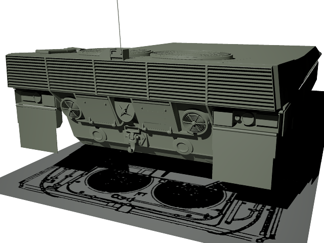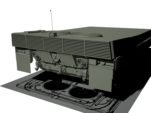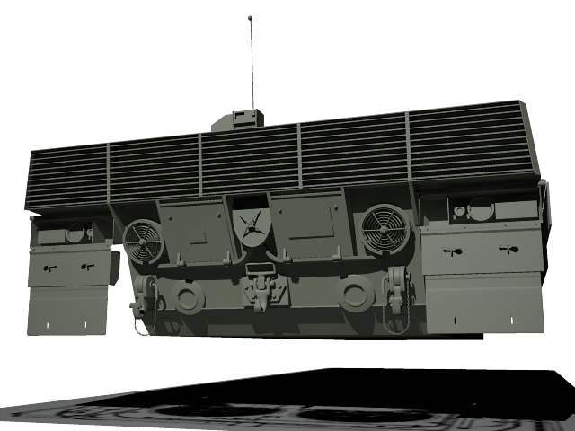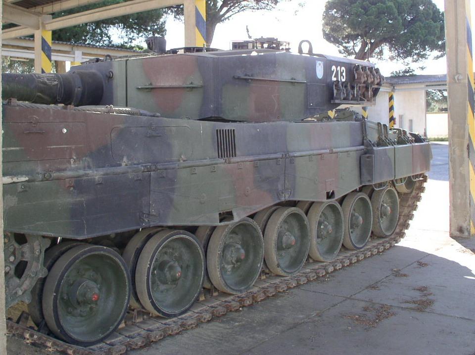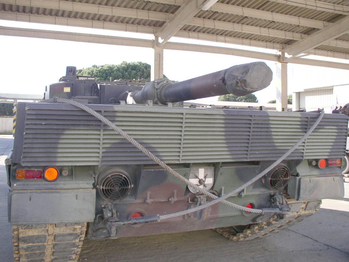 Una de esas dos cajas que lleva a los lados, creo, ojo, creo, que es el teléfono con el que se hablan con los de dentro. Todos los carros lo llevan, pero cada uno en una parte diferente la parte trasera, por supuesto. Esto se aprende sobre la marcha. El motor que lleva éste bicho es el mejor motor del mundo, MTU alemán de 1500 cv, hasta los americanos lo han colocados en algunos Abrams, coge los 70 sin despeinarse por carretera, aunque me han dicho que hasta 85 pillan los 2e y eso que pesan unas 20 tm más, es el más rápido, tiene un alcance de cañón (el Leopard 2E) de 4 km y atinando.