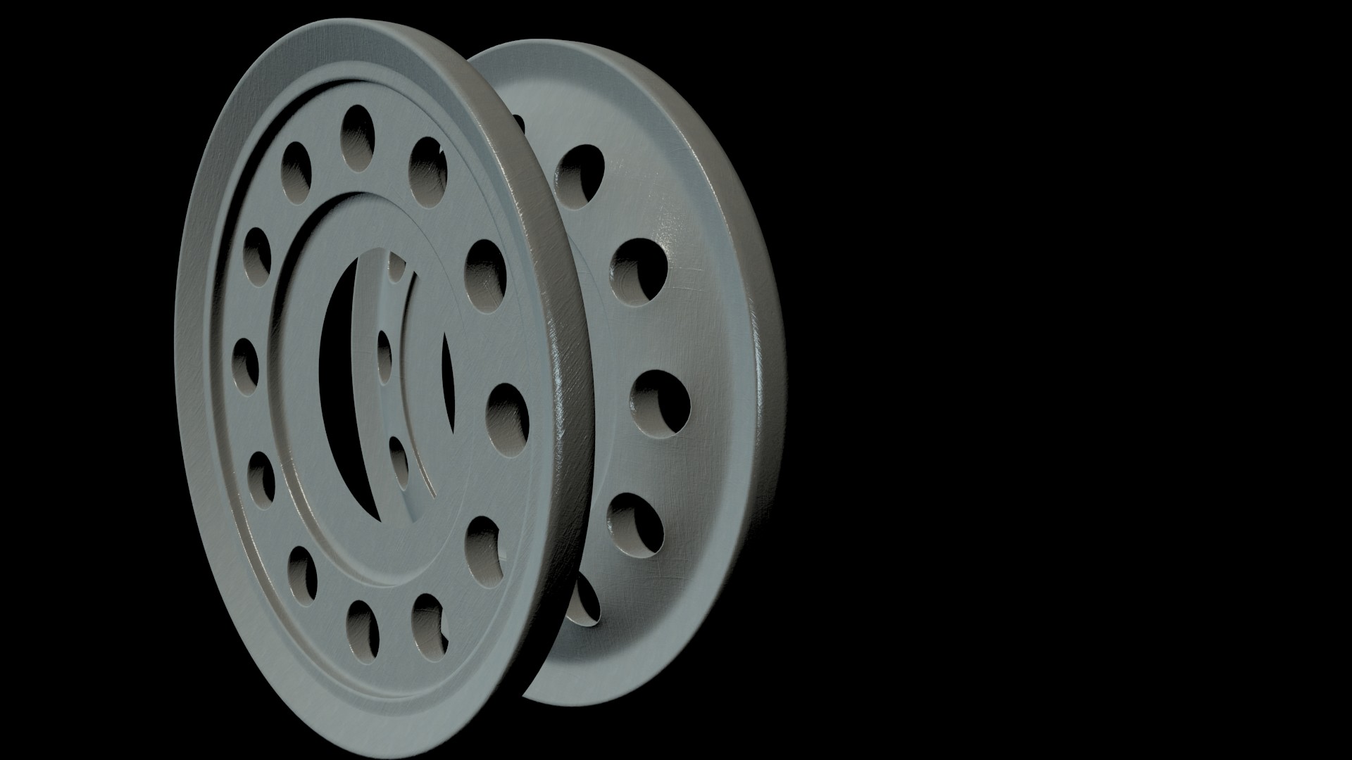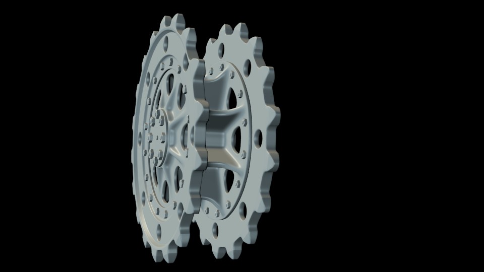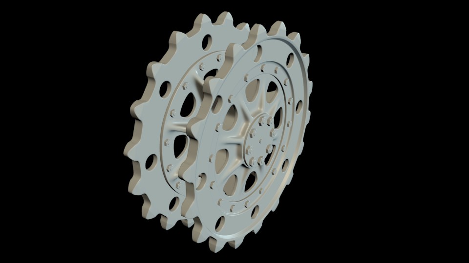 Les presento dos ejemplos en la rueda tensora. La textura con el material oxidado y una textura de material al natural. (el borde de la rueda requiere de otra textura en estos ejemplos se empleo la misma).