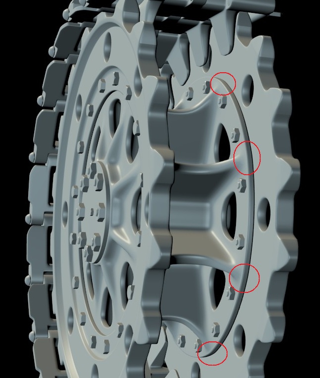Siguiendo las observaciones de Karras y rafa120. Aquí les muestro la rueda motriz con los eslabones integrados. Saludos.