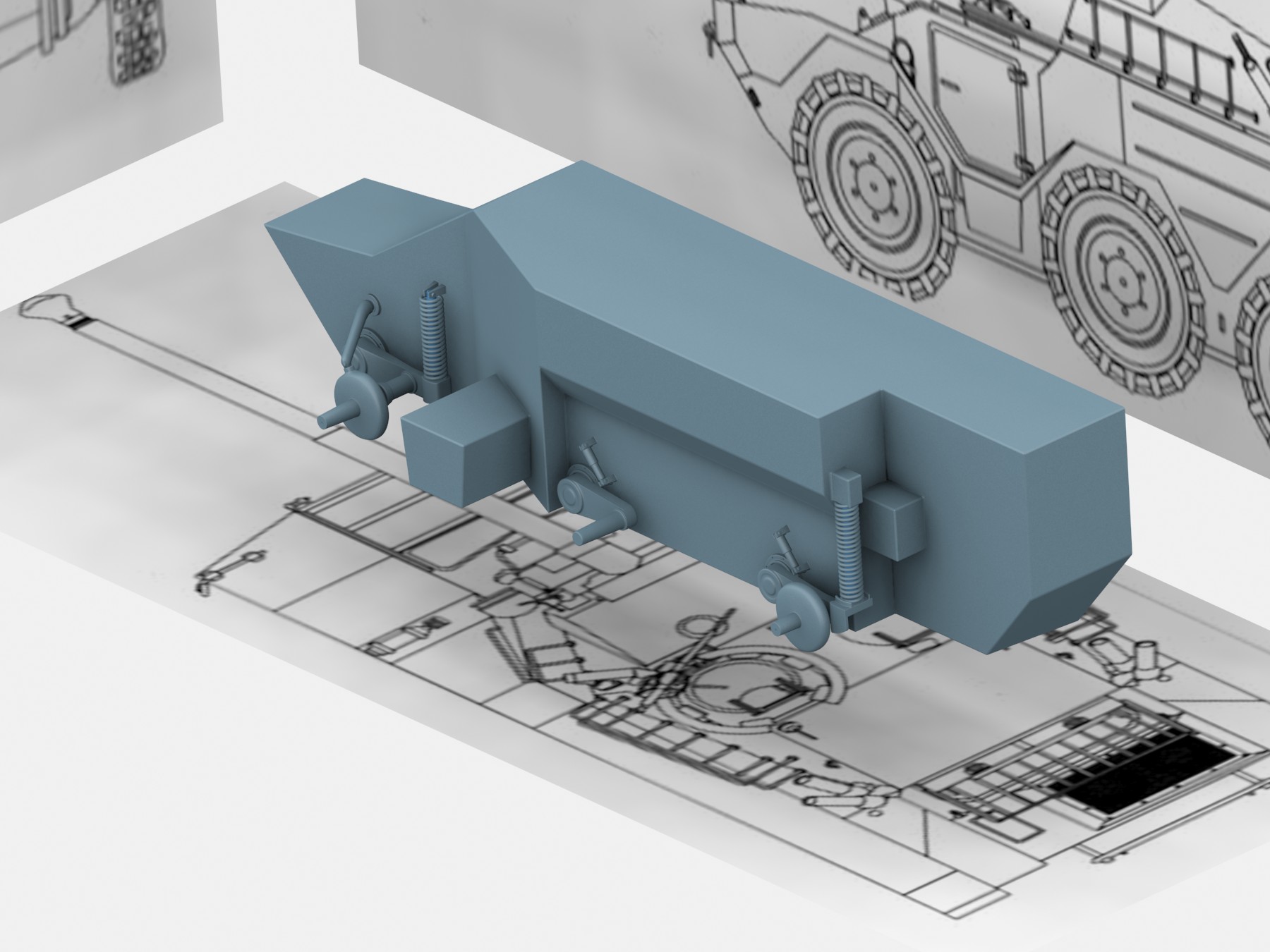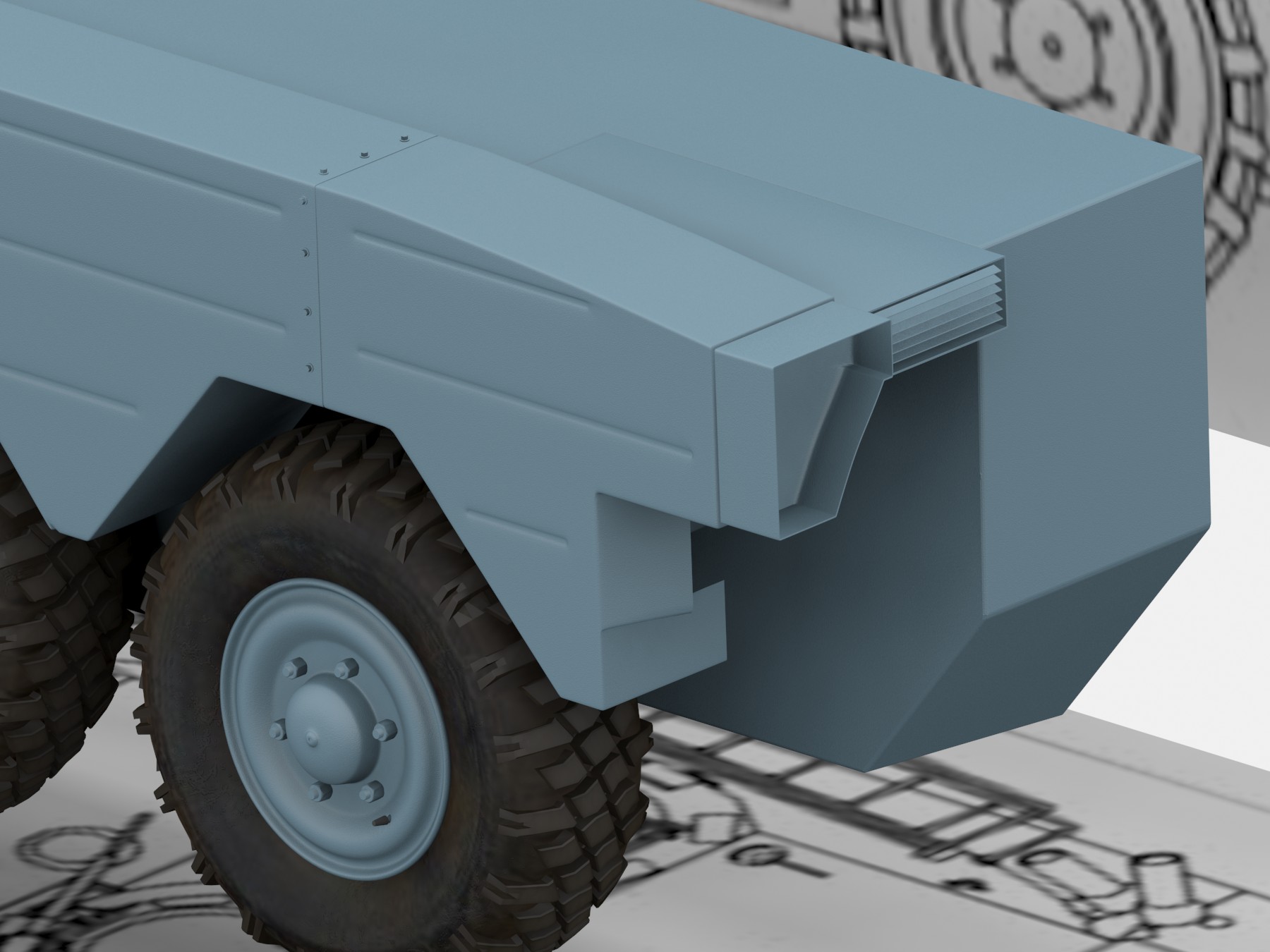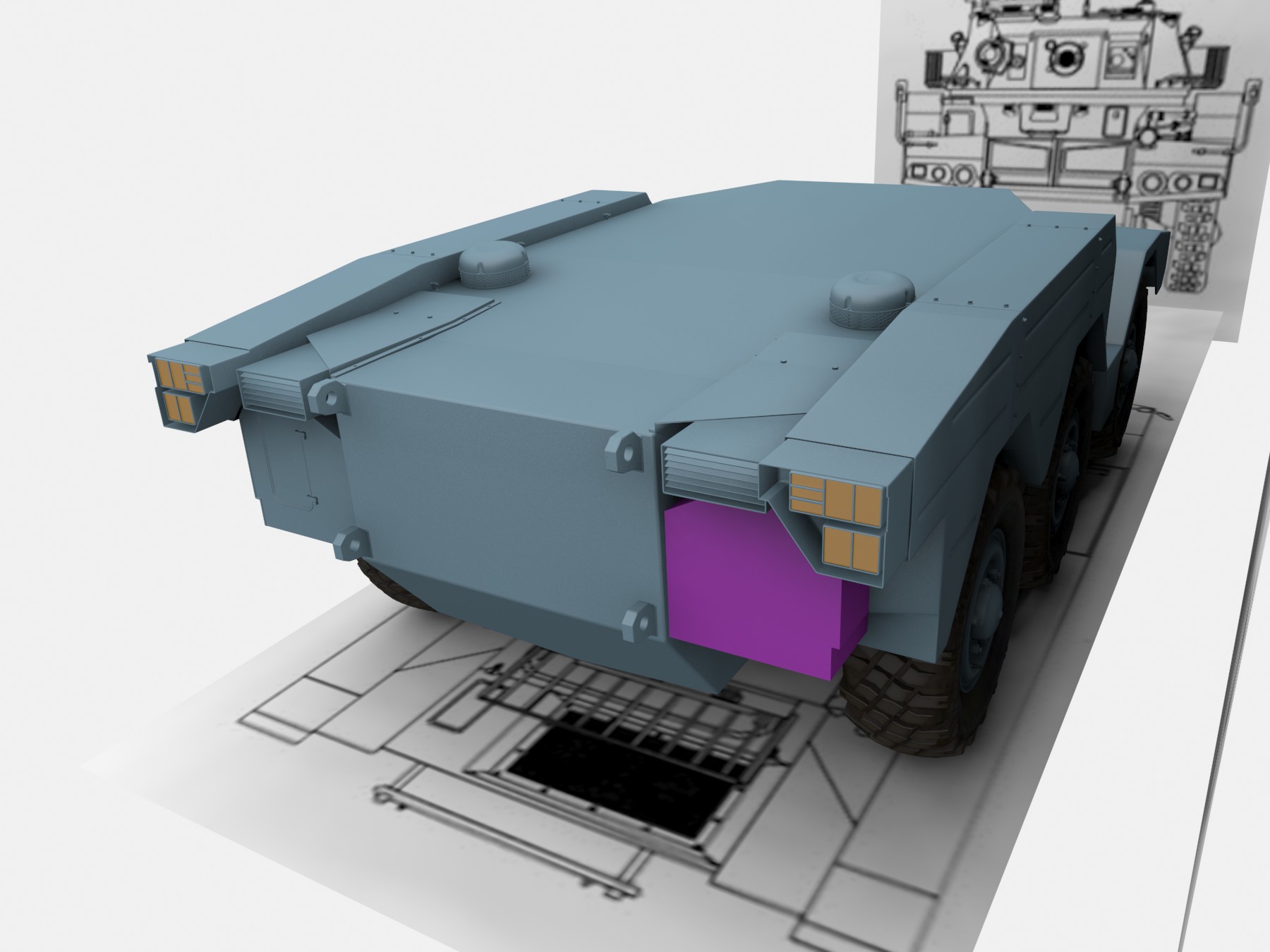 Por la trasera, empezando. En el hueco de la caja, irán las luces. Debajo de las rejas va una caja de la que sale el tubo de escape del motor. Antes iban unas turbinas con hélices para ir por agua, pero en los gabachos se las han quitado y han colocado unas cajas. Ni idea de lo que llevan. Particularmente me molaba con las turbinas, pero como hay muchas versiones, me decido por la francesa, pero con ruedas nuevas. Las que llevan son de cuando los primeros BMR españoles, así que, supongo que, se las habrán cambiado también, ya que en versiones de exportación (más nuevas) llevan las que he hecho.