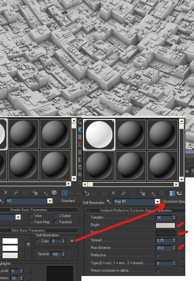 Un pequeño tutorial rápido y corriendo que estoy trabajando y voy con el tiempo pegado. Bajando la intensidad del color blanco y gris del Ambient Occlusion podemos poner un sol para que marque la sombra, ya que si iluminamos con blanco puro será tal la auto iluminación que no se marcara la sombra del sol. Lo marcado en rojo es con lo que podéis empezar a trastear parámetros.