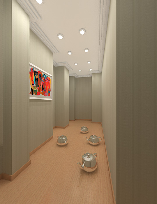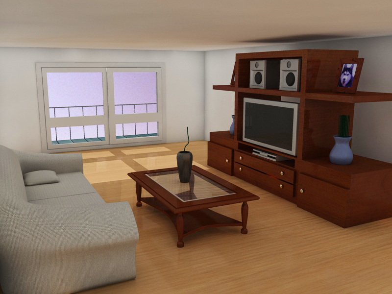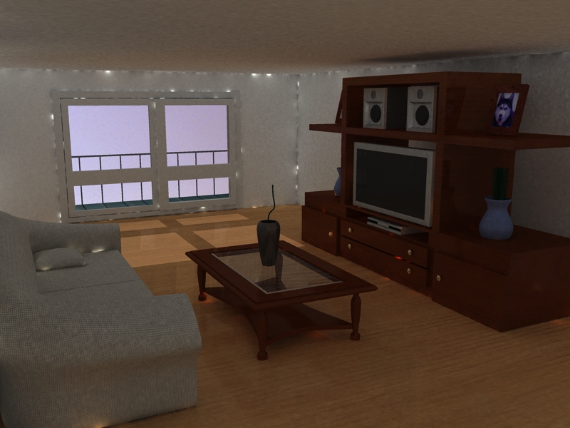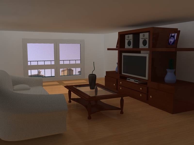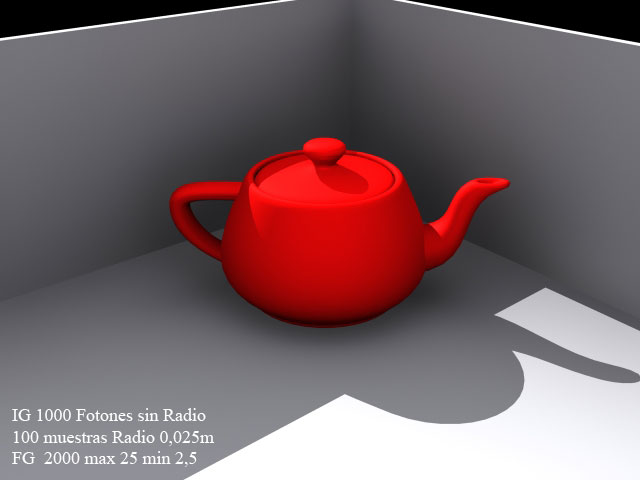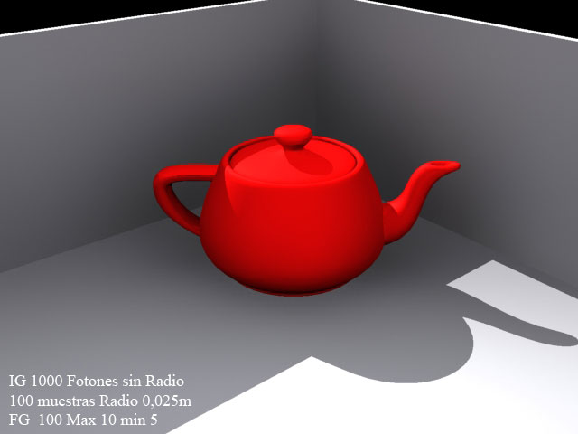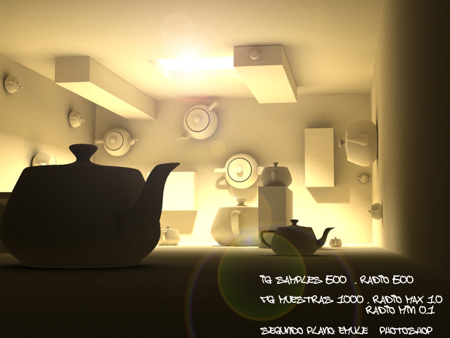 Una pruevecilla, Final Gathering + área light + reflexiones y fallof en el FG. Tiempo: 53 segundos. Pentium IV 3.2 GHz 1 Gb de RAM.
