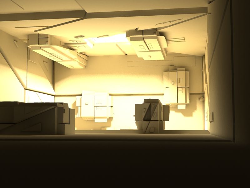 Rasheck muy buen tiempo de render, pero la calidad de la IG o (GI) es poco creíble, de hecho, parece hecho con Scanline y luces estándar en 3dsmax, debe ser porque la luz no rebota lo suficiente.