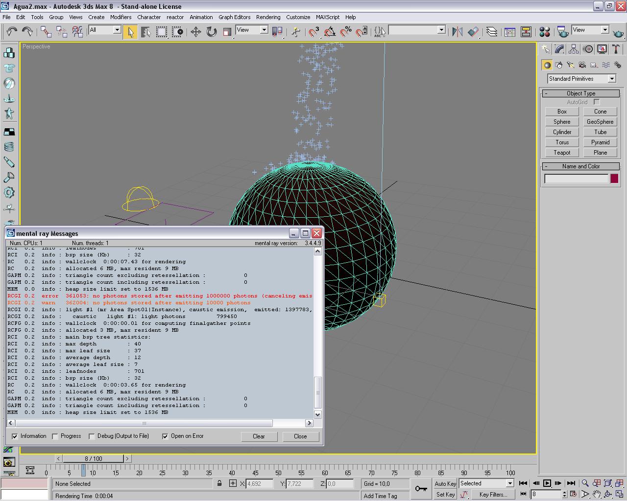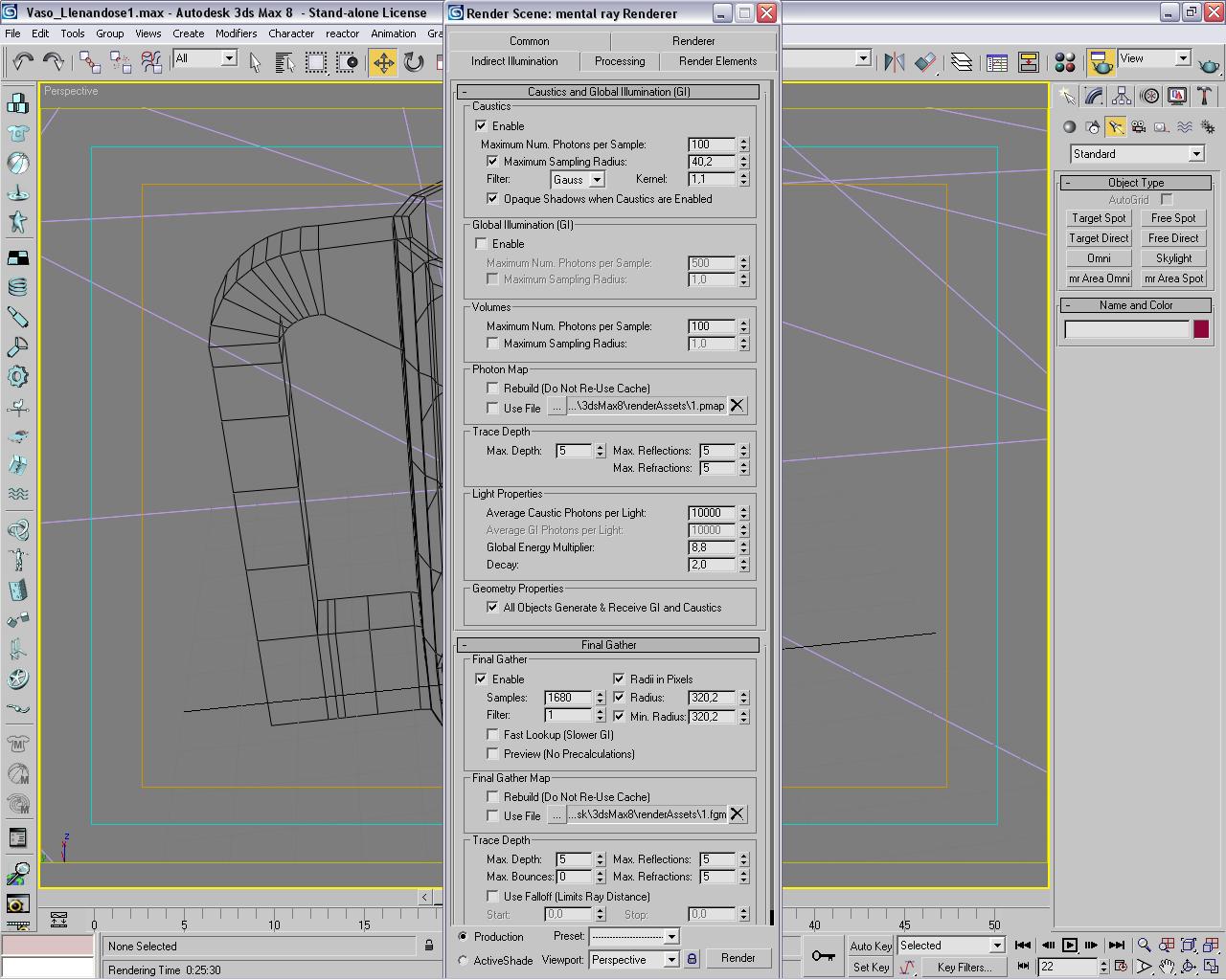 El render de prueba que hice demoro mucho cuando renderizaba creo que el antialiasing que puse fue mal configurado, el mapa de fotones se demoro poco menos de un minuto.