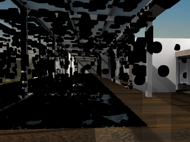 Mi problema ahora es que en el proyecto que trabajo (edificio de apartamentos), específicamente en el área de azotea y piscina, hice un render que ya más o menos me había gustado, y en cuanto replaceé el archivo con los muebles de terraza, salieron un montón de manchas negras. Inmediatamente borré los muebles para analizar cual había sido el problema, pero las manchas siguen ahí.