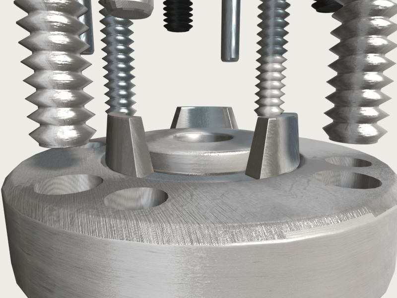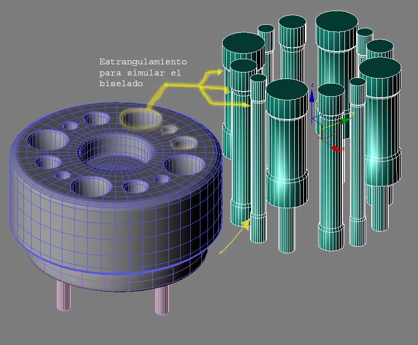 Primero modelé la pieza entera con su agujero central sus biseles y toda su historia, y a la hora de hacer los agujeros, en vez de cortar unos cilindros perfectos, hice unos cilindros con pequeñas estrangulaciones para simular el biselado cuando se los restará (madre que lío, mejor ved la imagen).