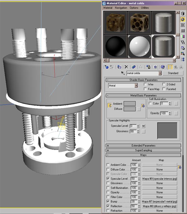 El material del acero no tiene mucho: En el difuso no le he puesto nada. Todo se basa en el Bump, el Specular y un poco de reflexión.