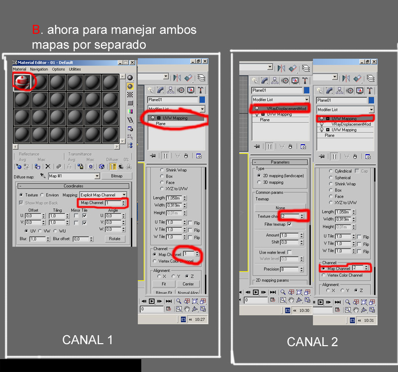 Buenas, a ver si me ayudáis con una cosa estoy haciendo una cubierta de tejas. Estoy utilizando Vray displacement, el problema viene cuando aplico uvwmapping, primero lo aplico para Vray displacement, pero después necesito aplicar otro para la textura de la teja, entonces no puedo tener dos mapeados aplicado a un único plano y para dos cosas diferentes.
