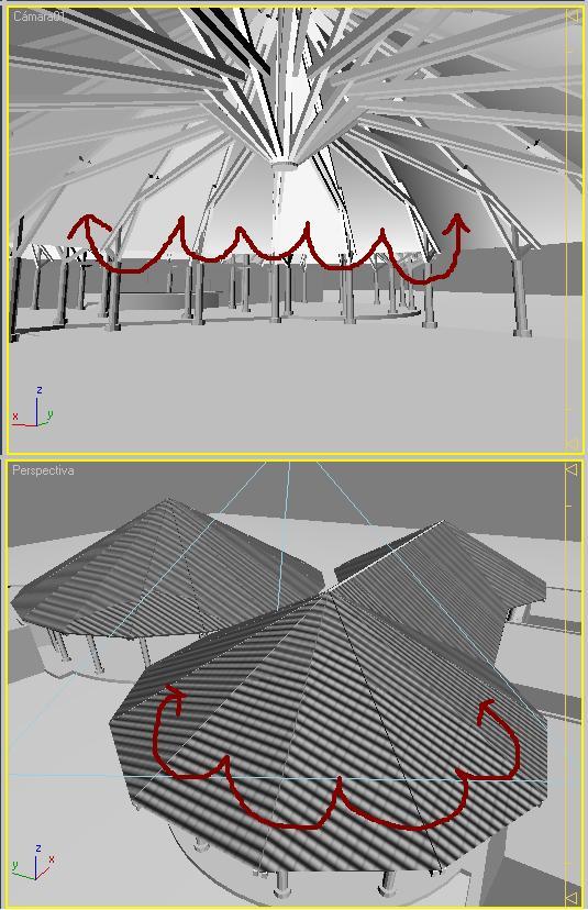 Por otra parte, pongo otro ejemplo, tenía un modelo de un quiosco que construí hace años y me puse a probar el bendito desplazamiento de Vray para el tema de los techos, pues oh sorpresa que no se pudo del todo, a razón de esto va mi pregunta, cuando los techos tienen diferentes direcciones hay que hacer el mismo procedimiento para cada cara? O hay otro método? En la gráfica pueden ver a que me refiero.