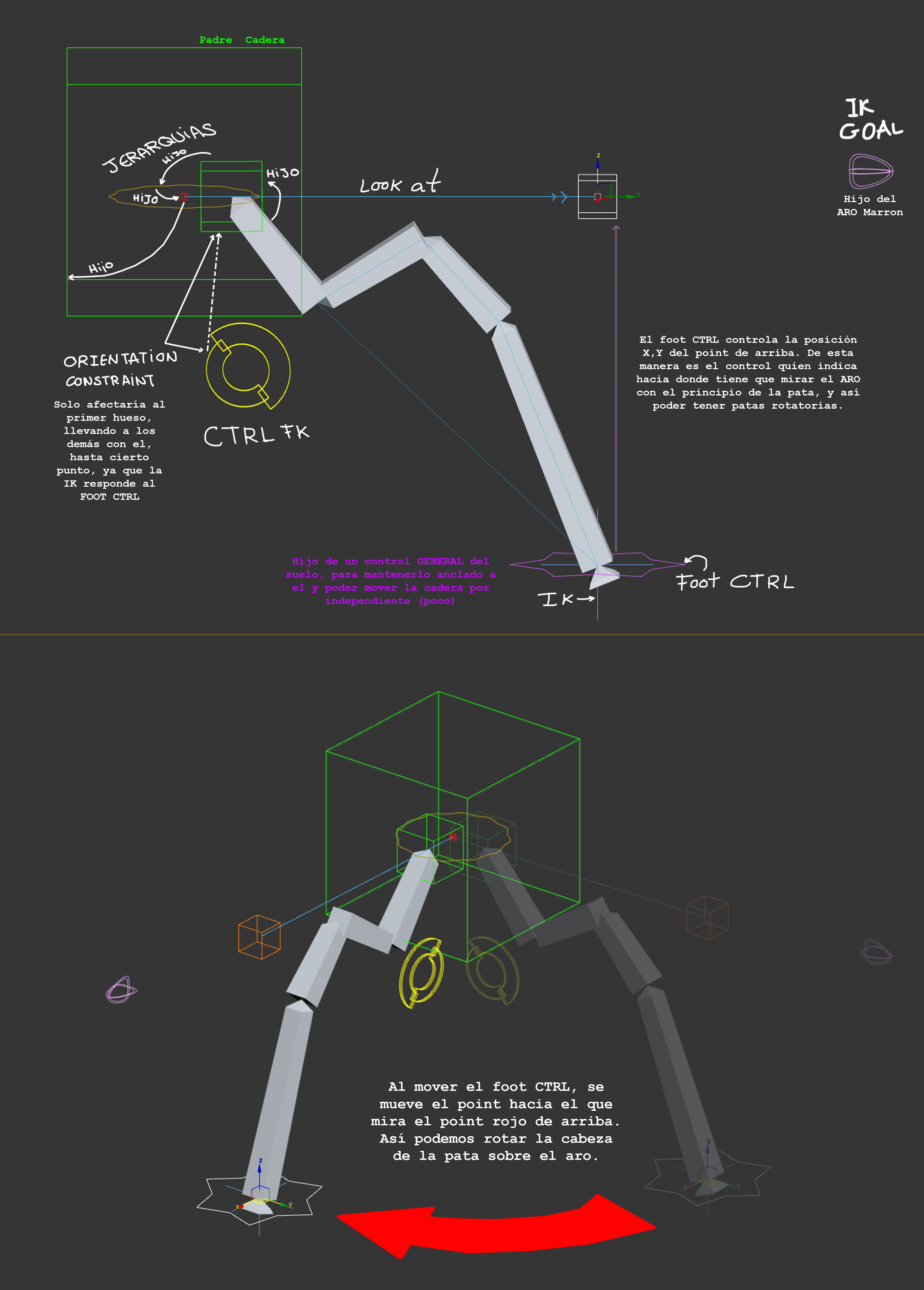 Actualmente estoy realizando un pequeño proyecto para mi portafolio en el que estoy elaborando el Rig de un robot. Sin embargo, las patas me están dando bastante quebraderos de cabeza. Adjunto fotografías del mejor de mis complejos intentos, ya que estoy intentando hacerlo en IK, para mayor comodidad del animador (aunque probablemente la solución sea controles FK).