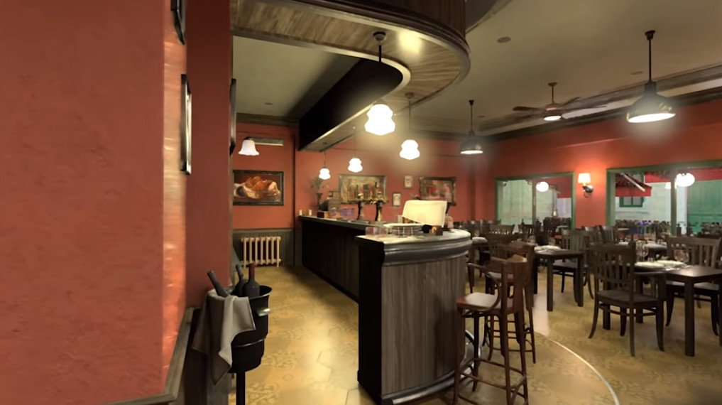 La segunda demostración muestra una escena de muestra llamada The Bistro donde se pueden ver más de 80.000 triángulos iluminados emitiendo simultáneamente. Como consecuencia toda la sala se llena de luz gracias a RTX Direct Illumination (RTXDI). Además, los Denoisers en tiempo real hacen que la escena se vea pulida y se suman al aspecto cinematográfico.