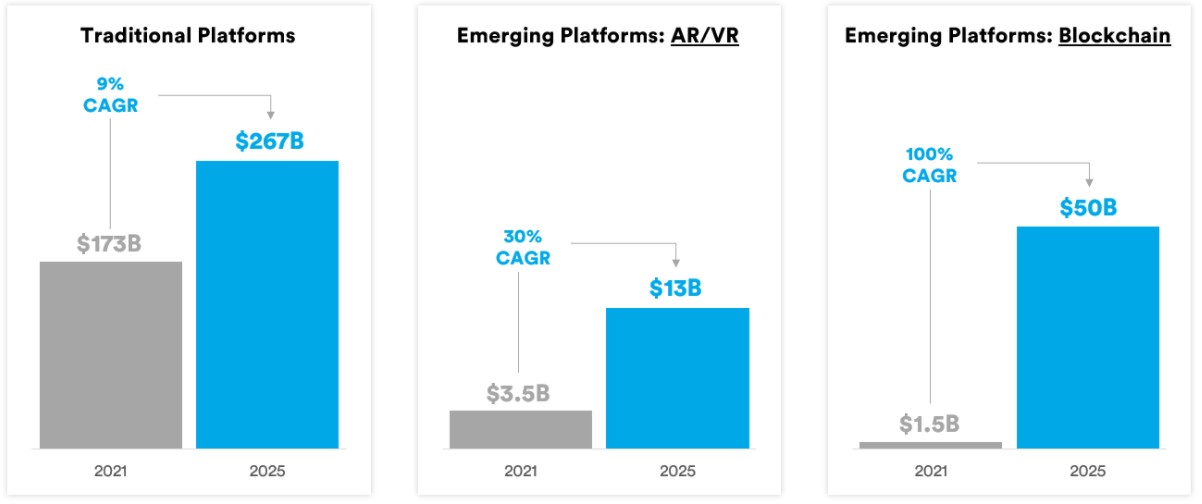 También hemos adoptado enfoques conservadores para lo que nos referimos como "Plataformas emergentes", en las que incluimos juegos de realidad virtual, AR, basados en la web, HTML5 y blockchain. Finalmente, intentamos tener en cuenta las ventas y el comercio en los mercados grises, así como los ingresos por la venta de software de trampa.