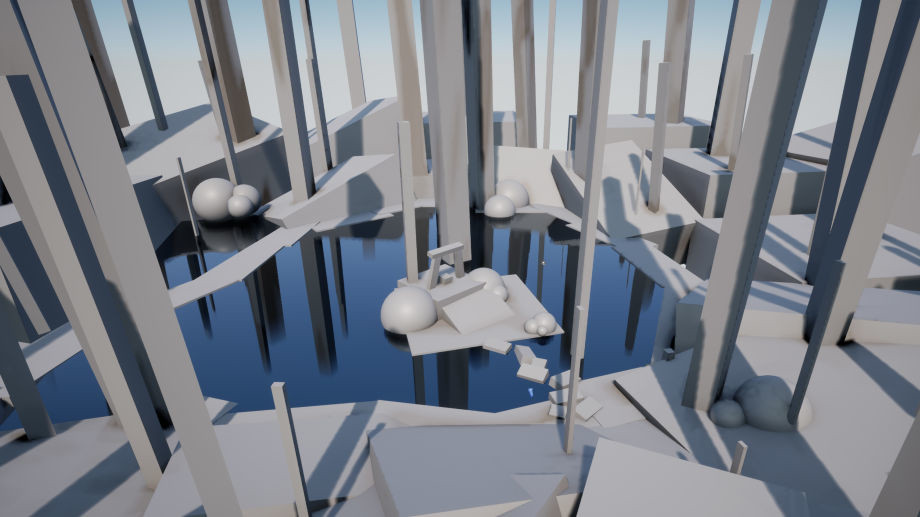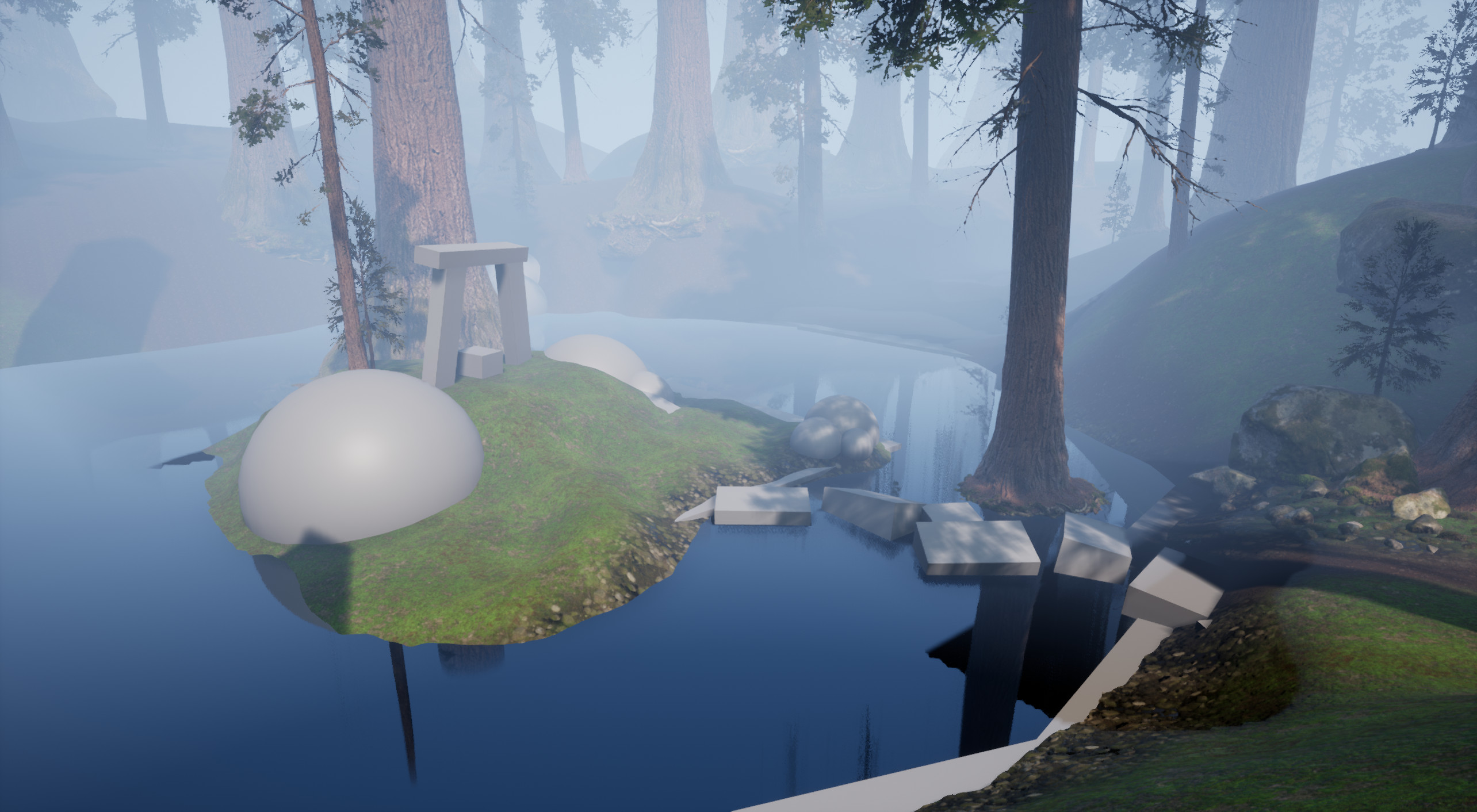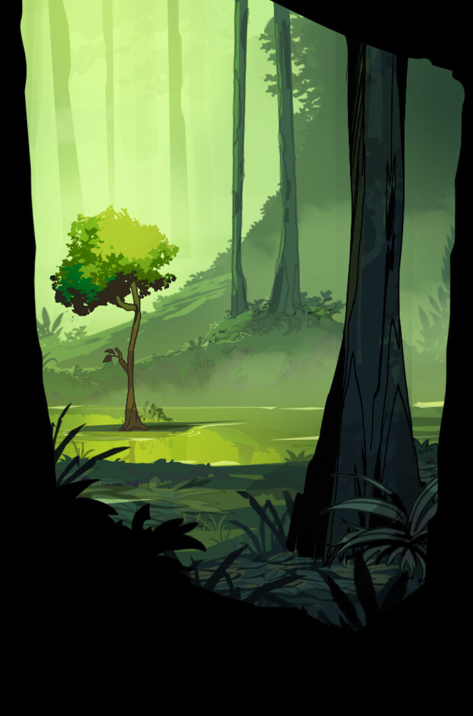 Lo primero que hizo fue construir el paisaje inicial basándose en la referencia. En la composición de la escena, planeó hacer una pequeña isla en el medio, el área alrededor de la isla llena de agua y grandes árboles para completar la composición. Aunque a medida que avanzaba el proyecto fue haciendo algunos cambios a la obra.
