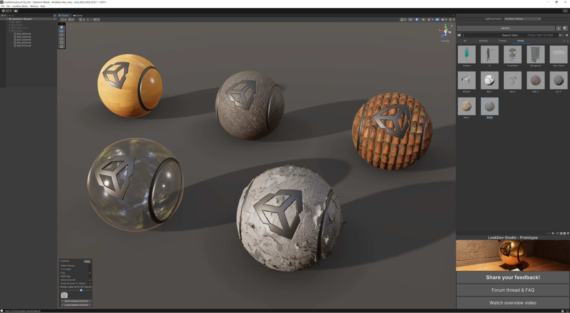 En la actualidad, LookDev Studio es un prototipo dirigido a artistas que trabajan en High Definition Render Pipeline (HDRP) de Unity. Su conjunto de características actualmente prioriza la capacidad de importar y ver activos individuales y dioramas pequeños en diversas condiciones de luz.