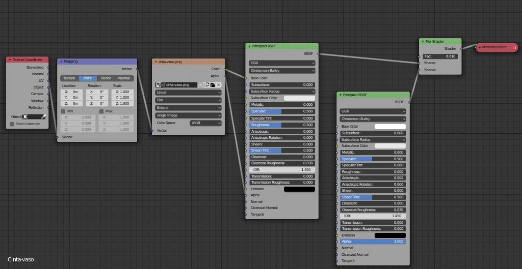 Estaba intentando hacerlo de manera que pongo el material de cristal a todo el vaso menos a las caras donde estará la pegatina, y a la selección de la imagen añadirle el material con un mix Shader pero creo que no se hace así.
