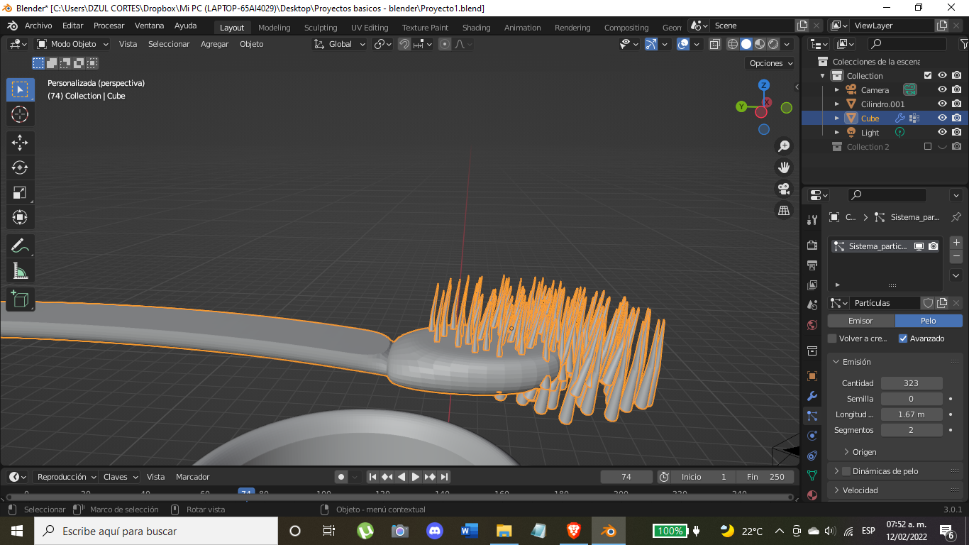 Bueno, estaba haciendo el tutorial de youtube de "La guía definitiva de Blender". Pero cuando empecé por el cepillo empecé a tener un error supongo en el sistema de particulas. El problema es que el "pelo" se sale de donde eh selecionado que deberia ir.