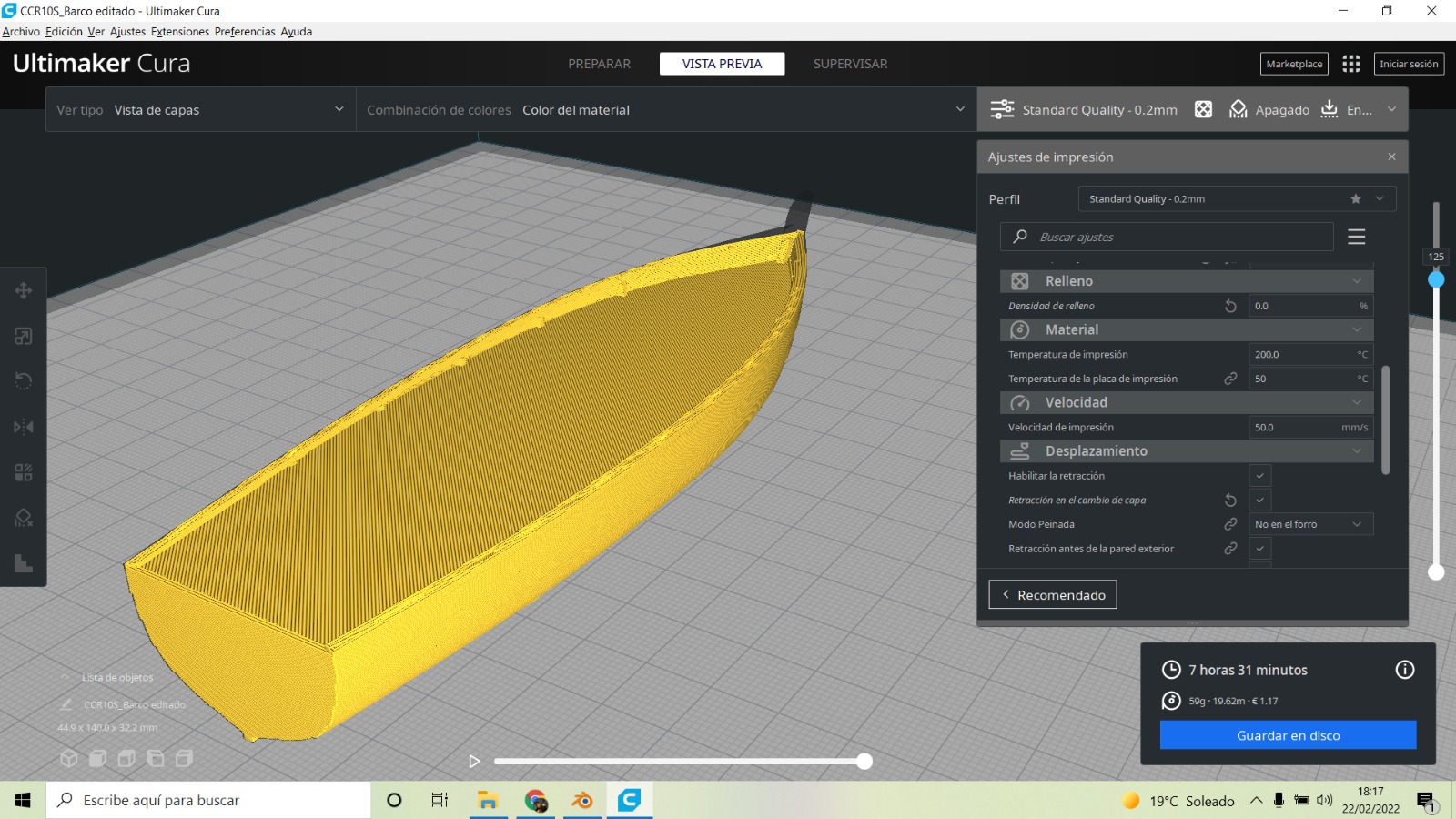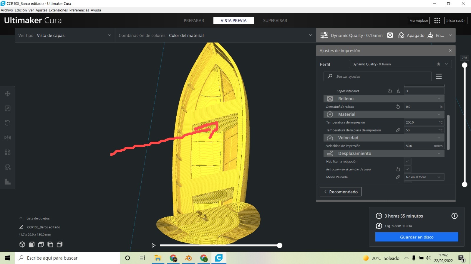 Debajo de los asientos del banco del barco (tremenda redundancia) no debería haber hueco (si bien es cierto que a lo mejor no puede hacer en el aire el asiento, pero todos sabemos que si la distancia es poca con suerte y una velocidad de impresión baja) he probado a hacer el barco en posición horizontal, pero como veis en la tercera imagen me lo rellena todo.