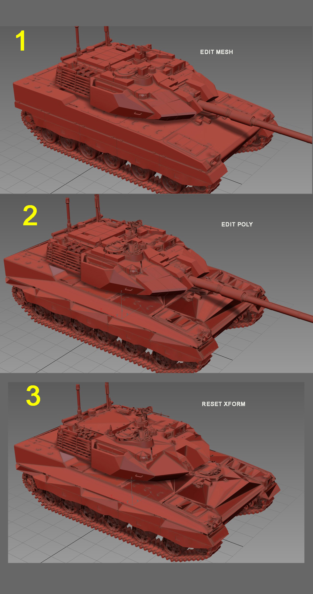 os subo una imagen. La imagen del carro en la uno es importado en OBJ, que supongo que lo triangula al exportar, en FBX también, eso si que no lo sabia yo. La imagen 2 es como se me queda con las caras esas desvirtuadas y que por mucho Smooth y lo que sea, no quedan ya bien . Aunque puedo echar para atrás con deshacer y volver a edit mesh y queda bien otra vez, aunque triangulado. Y la imagen 3 es la del Reset XForm y esa si que no tiene vuelta atrás. El 3ds Max dice que no hay vuelta atrás y que te jodas con lo que hay.