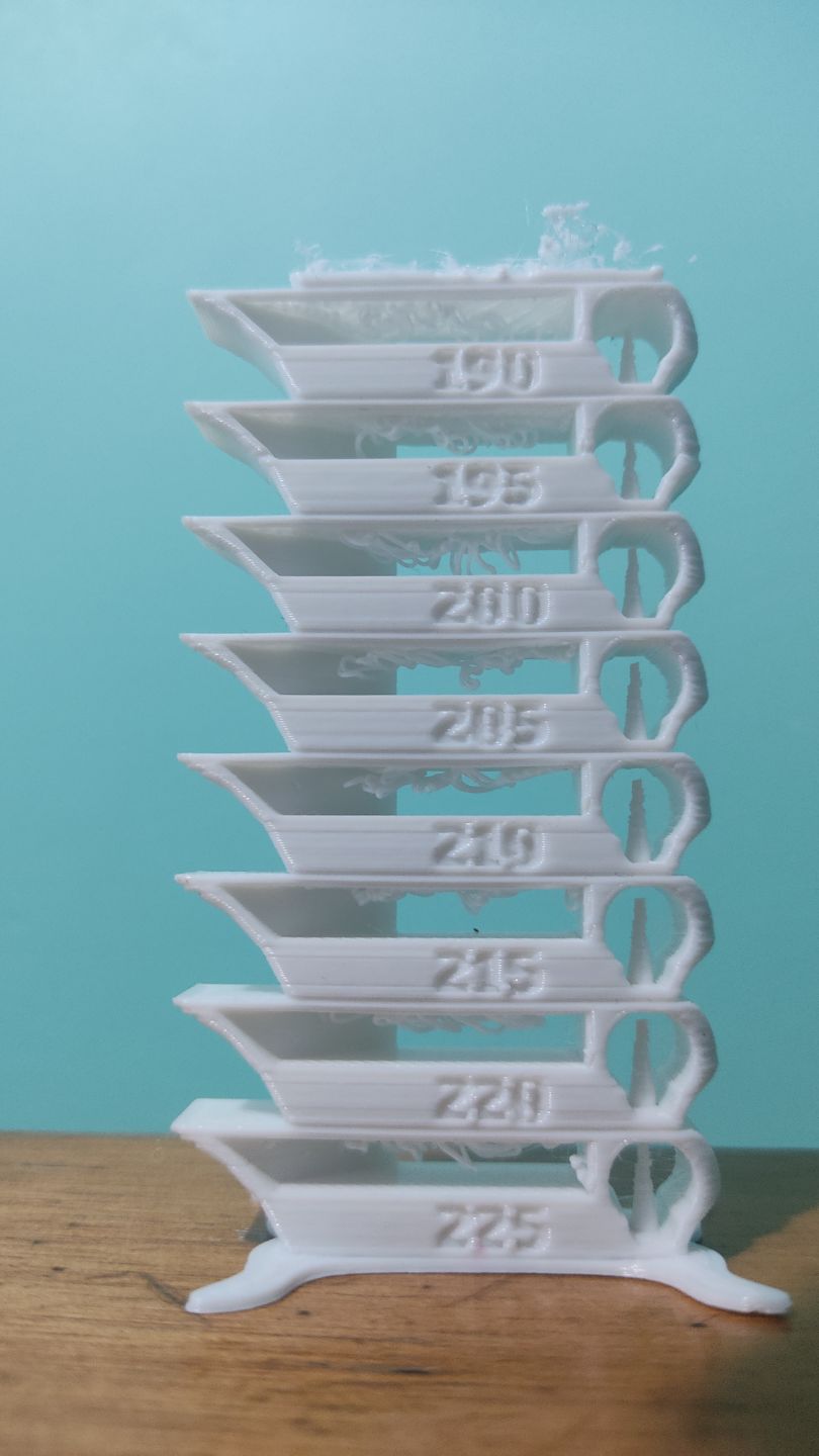 La torre la saque thingiverse, y segui los pasos de un tutorial de YouTube, esta desde los 225 grados bajando de 5 en 5 hasta los 180 grados, por lo que las dos últimas pruebas no se imprimieron ya que el mínimo del PLA que use es de 190 grados.