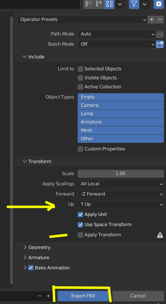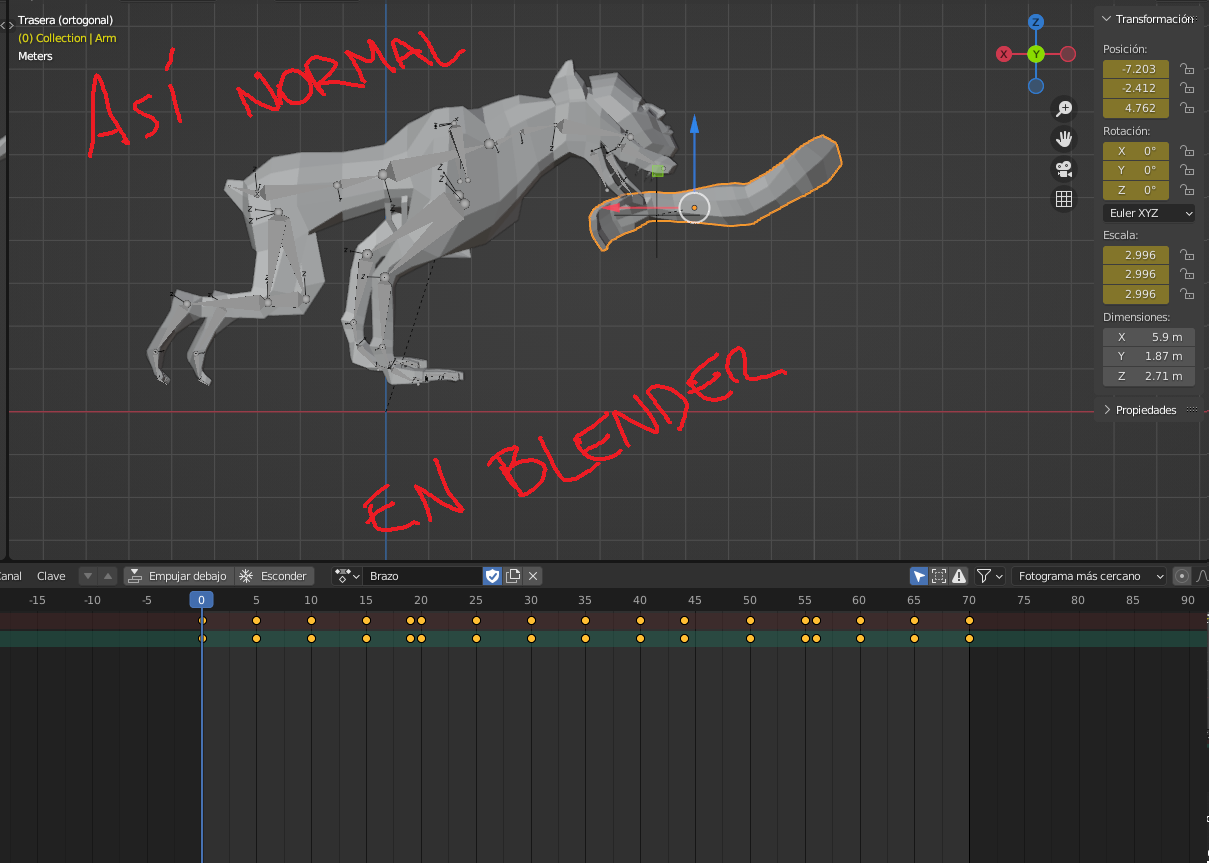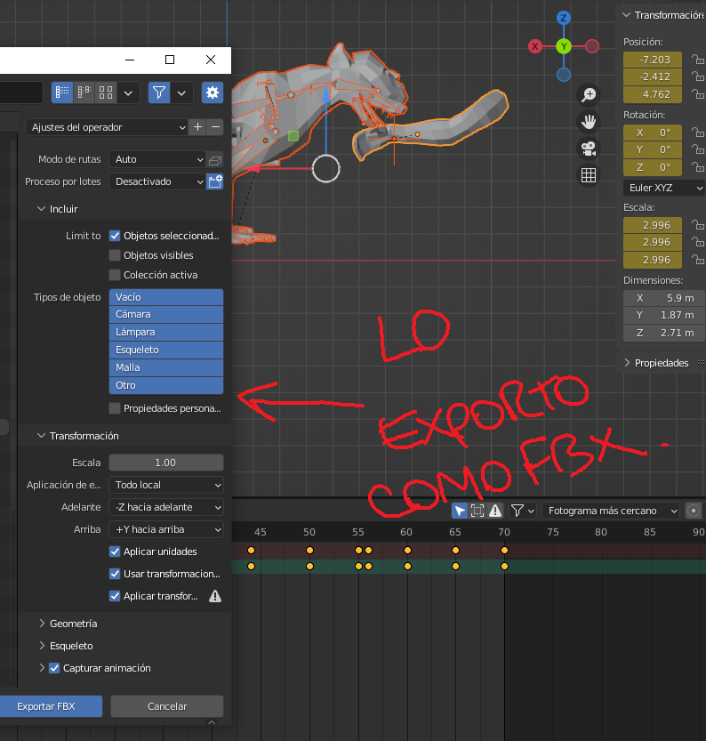 Hola qué tal, soy nuevo en esto de animación y modelado en Blender. Verán, tengo un brazo con una animación sin rig y un perro con una animación con rig. Cuando exporto con los settings que se ven en la imagen (he probado también destildando "aplicar transformaciones") e importo el brazo en Unity se ve de esta manera.