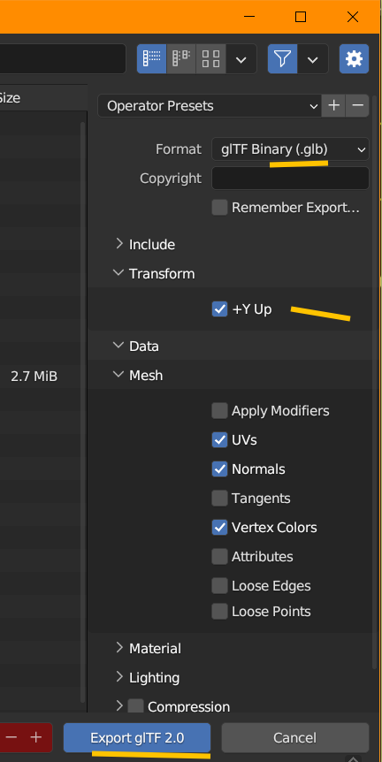 Hola, necesito exportar en formato glb o glft, pero al momento de exportar el archivo termina pesando 1kb a 500 kb, y en godot aparecen los huesos de forma extraña.
