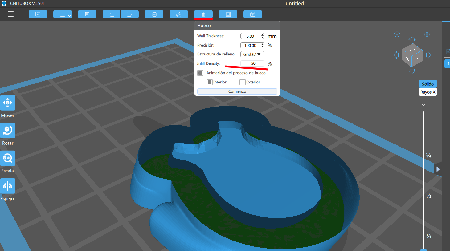 mi sorpresa viene cuando al abrir el archivo en CHITUBOX el archivo está totalmente hueco con una anchura de pared muy reducida lo cual hace a la figura imprimible.