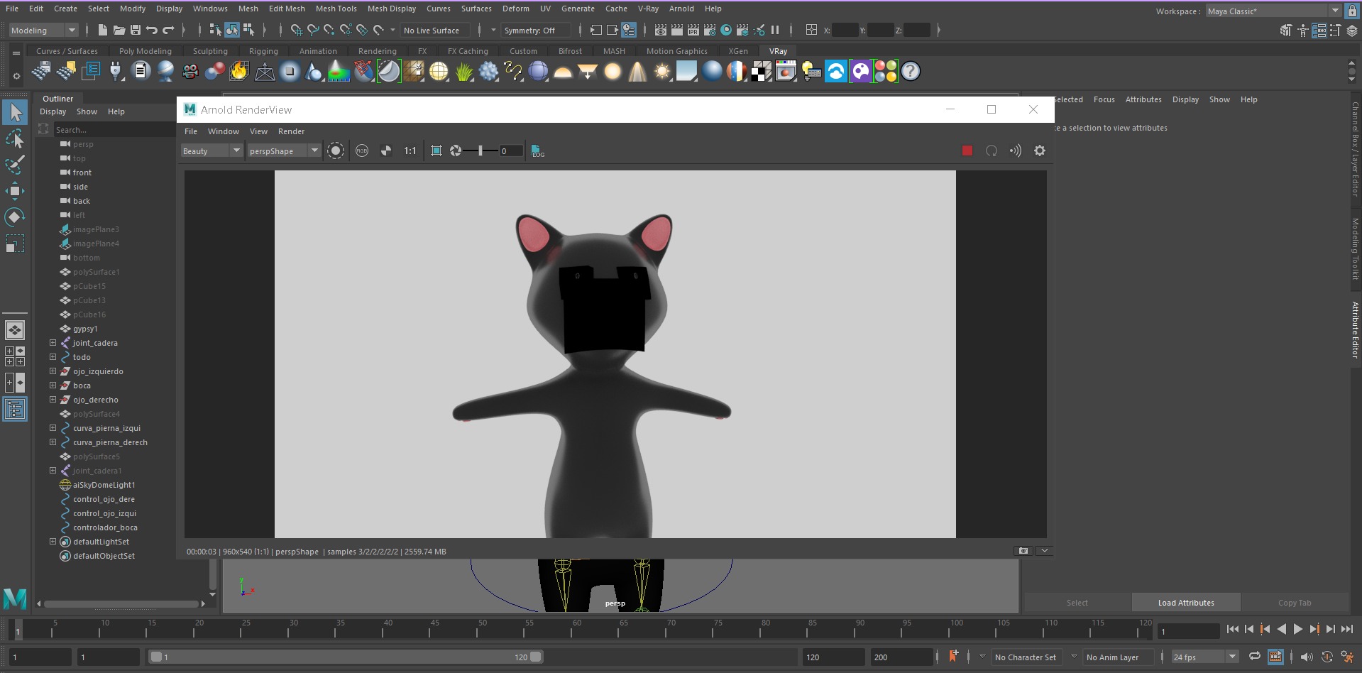 Hola buenas tardes, quería hacer una pregunta, estoy haciendo un personaje en Autodesk Maya y le he colocado texturas 2D en unos planos tanto la boca como los ojos, todo bien, pero cuando quiero hacer un render en Arnold los planos se ven negros y no sé por qué no encuentro la solución.
