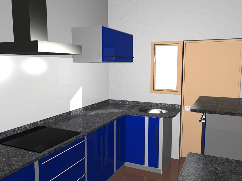 Buenas, aquí les dejo una imagen de una cocina que estoy diseñando, soy nuevo en el tema y me gustaría darle algo más de realismo a la imagen. Para empezar decir que este diseño está hecho con AutoCAD 2007. Mi primera duda me aparece con la luz. He puesto 4 luces puntuales, pero me gustaría que no se viera reflejada en superficies reflectantes, o de qué manera puedo iluminar mis escenas para darle luz ambiental sin este problema.