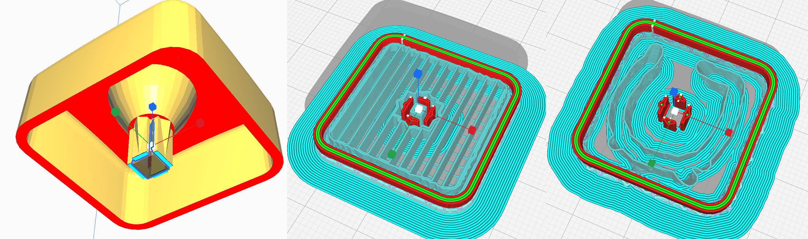 En esta imagen podéis ver el modelo en Cura con el bloqueador en el centro, con soportes normales que pasan por alto el bloqueador y colocan el soporte de todos modos, y a la derecha, como un modelo en forma de árbol, en el que se ve que no agrega el soporte.