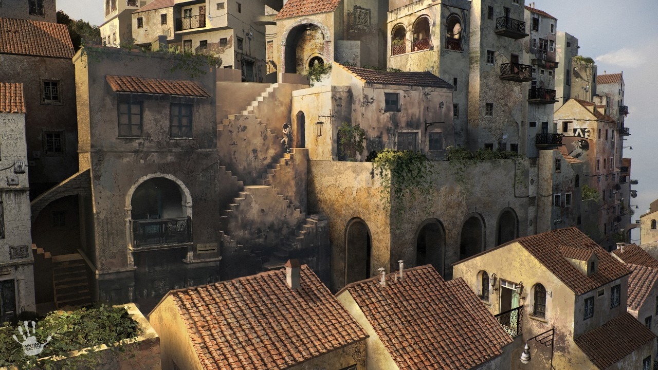 A través de este proceso, Joel y yo queríamos incorporar algo de magia para que no fuera tan mundano. Había días en los que Joel y yo íbamos a la piazza y nos sentábamos en el café, ¡y parecía que estábamos de vacaciones! Trabajé con uno de los artistas conceptuales en 2D y fotografié algunos de los decorados. No se pueden hacer locuras con la arquitectura, de lo contrario, parecerá fuera de lugar, pero se pueden hacer cosas con diseños de azulejos, puertas y herrajes.