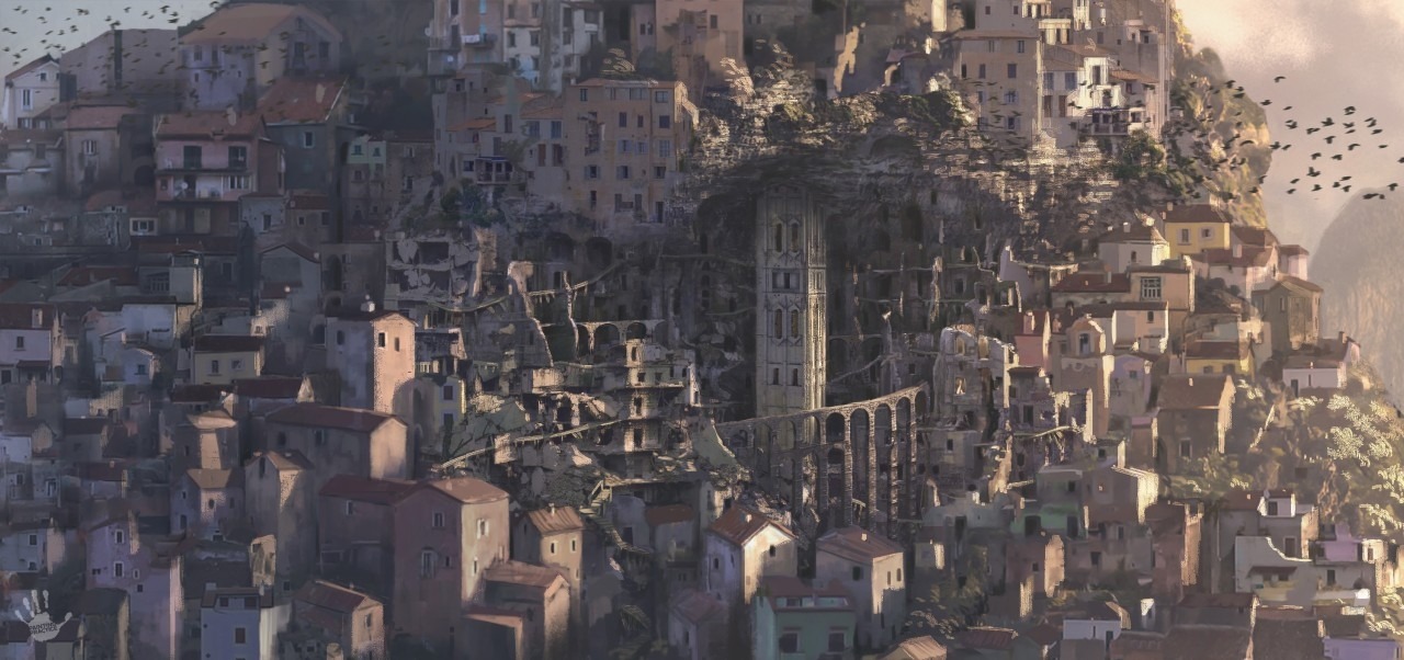 Aunque se añadieron aeronaves y gárgolas a la fotografía original de Oxford para la versión alternativa donde Lyra vive, las ciudades italianas sirvieron de inspiración para la construcción escenográfica de Cittàgaze. "Hice varios modelos 3D rápidos para mostrar a Joel cómo podíamos construir la plaza pública y luego lo modifiqué un poco", comenta May. "Fuimos a Italia y existía el peligro de que construyéramos el set en un estudio [en Gales] y pareciera que estuviéramos en Italia, ¡pero con mal tiempo!