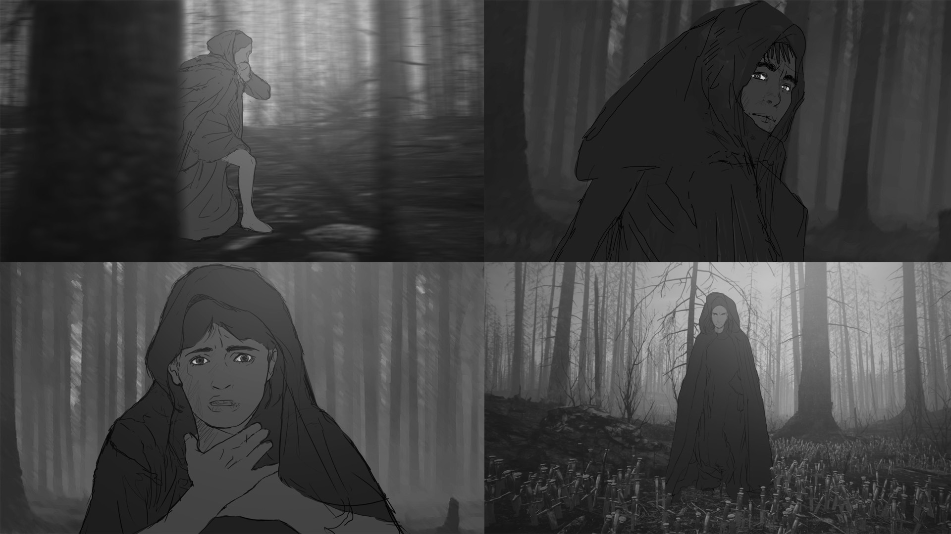 Se decidió incluir pollos negros en la historia para subrayar la naturaleza oscura de la narración y del personaje principal invisible. Los activos de Animalia se utilizaron para crear los pollos negros, cambiando sus texturas y materiales. También se trabajó en las interpolaciones de animación. Se usaron conjuntos de animación de Mixamo para la captura de movimiento y las túnicas se modelaron en Marvelous Designer. Las texturas y materiales se crearon en Substance 3D Painter y el diseñador de vestuario histórico Daniele Gelsi supervisó cada aspecto artístico. En la escena final, hay figuras encapuchadas esperando al protagonista frente a una gran fogata.