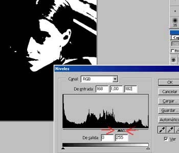 Empezaremos por la capa superior luces. Seleccionamos la capa y abrimos el ajuste niveles (imagen/ajustar/niveles Control + l). En esta capa debemos conseguir la luz fuerte de la fotografía y una buena silueta de luz en la que se aprecien, con buen detalle, los ojos, la nariz y la boca, al igual que otros detalles adicionales, pero siempre dejando un efecto de muy alto contraste manejando las manecillas del efecto niveles siempre muy juntas. Si os fijáis se parece mucho a la forma de iluminar de algunos cómics. Los valores que he usando ahí pueden variar dependiendo de cada imagen. Una vez aceptemos el ajuste, bajamos la opacidad de la capa a 80% y le cambiamos el modo a trama.