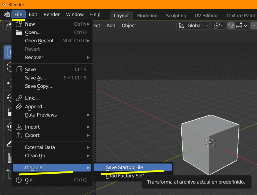 Y luego guardas esa nueva configuración con File > Defaults > Save Startup File
